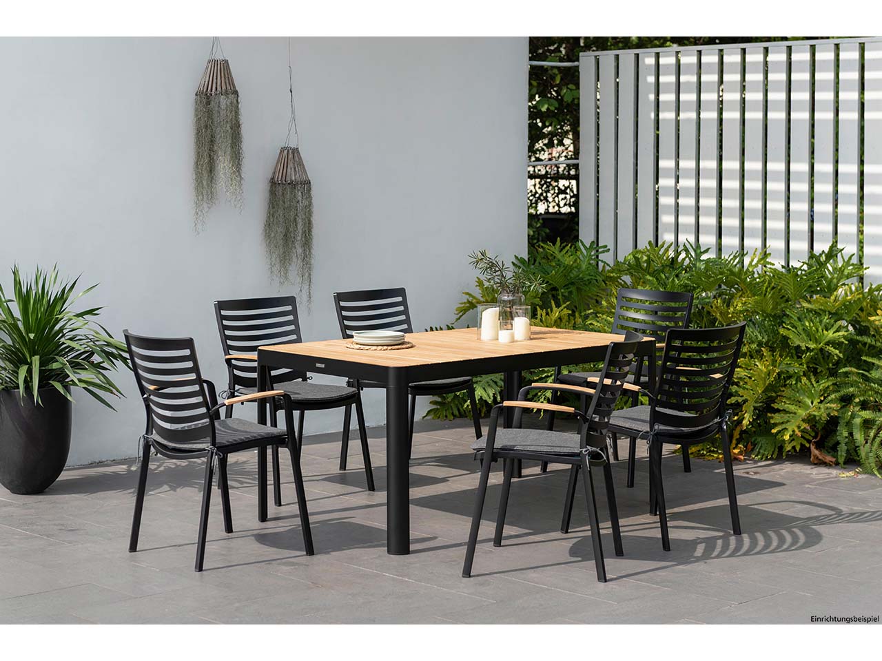 Bitte Platz nehmen: Dieses Set ist perfekt, um im Garten oder auf großen Terrassen zusammenzusitzen. Das Set besteht aus einem Esstisch in 161 x 95 cm und sechs passenden Stühlen. Im Design sind die Gartenmöbel perfekt aufeinander abgestimmt und punkten mit harmonischen, runden Formen und zeitlos-eleganter Optik. Die Gestelle sind jeweils aus pulverbeschichtetem Aluminium gefertigt, was ihnen eine langlebige Qualität verleiht. Ein Hingucker sind die Tischplatte und die Armlehnen aus FSC-zertifiziertem Teakholz. Für ganz viel Komfort beim Sitzen verfügen die stapelbaren Gartenstühle über Olefin-Sitzkissen. 1 Set = 1 Gartentisch, 6 Gartenstühle.