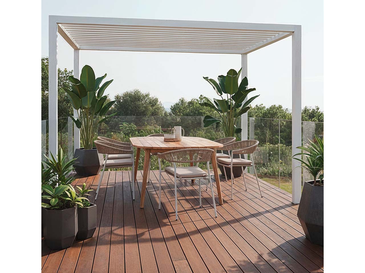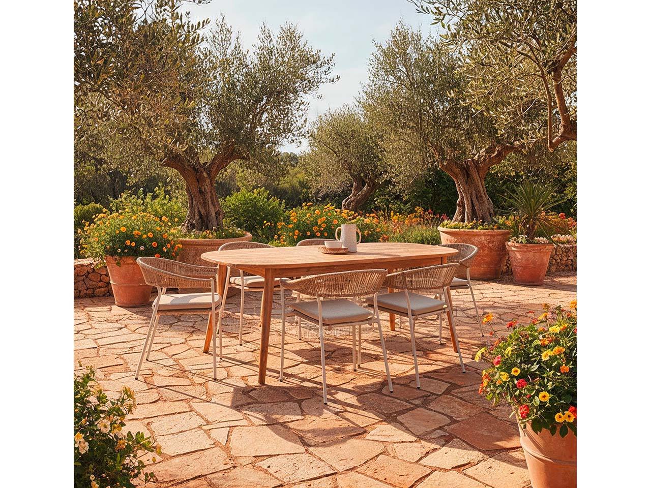 Viel Platz und viel Stil! Der großzügige Gartentisch lässt sich ganz einfach von 180 cm auf 240 cm ausziehen – dann ist Platz für die ganze Familie. Hergestellt ist der Outdoor-Esstisch aus FSC-zertifiziertem Akazienholz. Dazu passen die sechs hochwertigen, bequemen Gartenstühle mit robustem Gestell. Sie haben an Rückenlehne und Sitzfläche ein Seilgeflecht, das ihnen eine besonders ansprechende Optik verleiht. Die Gartenstühle sind platzsparend stapelbar.
