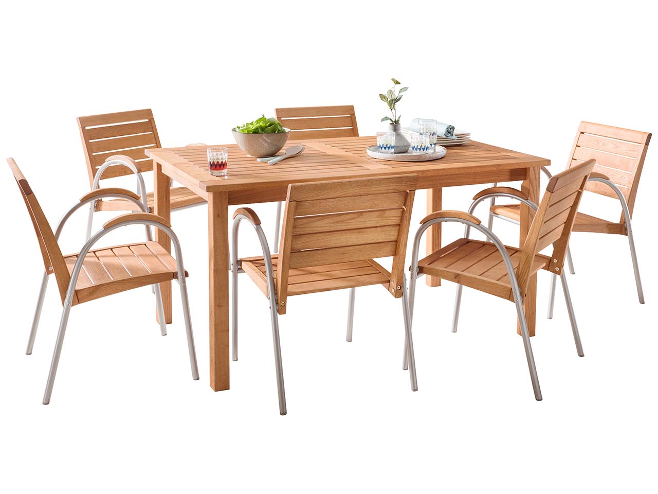 Hier kann man es sich im Garten, auf der Terrasse oder auf dem Balkon so richtig gemütlich machen: Das 7-teilige Gartenmöbel-Set „Solano“ überzeugt mit einem ansprechenden Design sowie der hochwertigen Verarbeitung aus FSC-zertifiziertem Robinienholz und stabilem Aluminium. Es besteht aus einem rechteckigen Tisch und 6 komfortablen Gartensesseln mit praktischen Armlehnen. Dank der ergonomischen Form der Stühle kann man hier mit Freunden und Familie die gemeinsame Zeit im Freien so richtig genießen. Das massive Holz in Kombination mit dem robusten Aluminiumgestell macht das Set besonders haltbar und langlebig, was durch die spezielle Lasur verstärkt wird. Sie schützt das Robinienholz vor Fäulnis und Pilzbefall. So können Tisch und Stühle das ganze Jahr über draußen bleiben und eine gemütliche Sitzgelegenheit bieten. Herstellung in Europa. Tisch: B 150 x T 90 x H 75 cm.