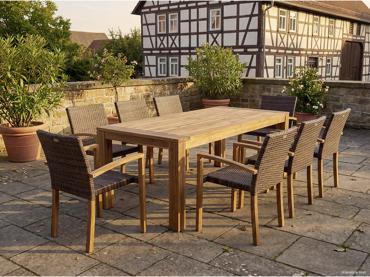 Geradliniger, moderner Stil zeichnet dieses Gartenmöbel-Set aus. Dank großem, rechteckigem Tisch und sechs stapelbaren Stühlen ist Platz für die ganze Familie. Die Tischgruppe aus FSC-zertifiziertem Akazienholz hat ein charmantes Design, das in den Garten oder auf die Terrasse passt. Die Stühle mit Armlehnen haben ein pflegeleichtes Kunststoffgeflecht.