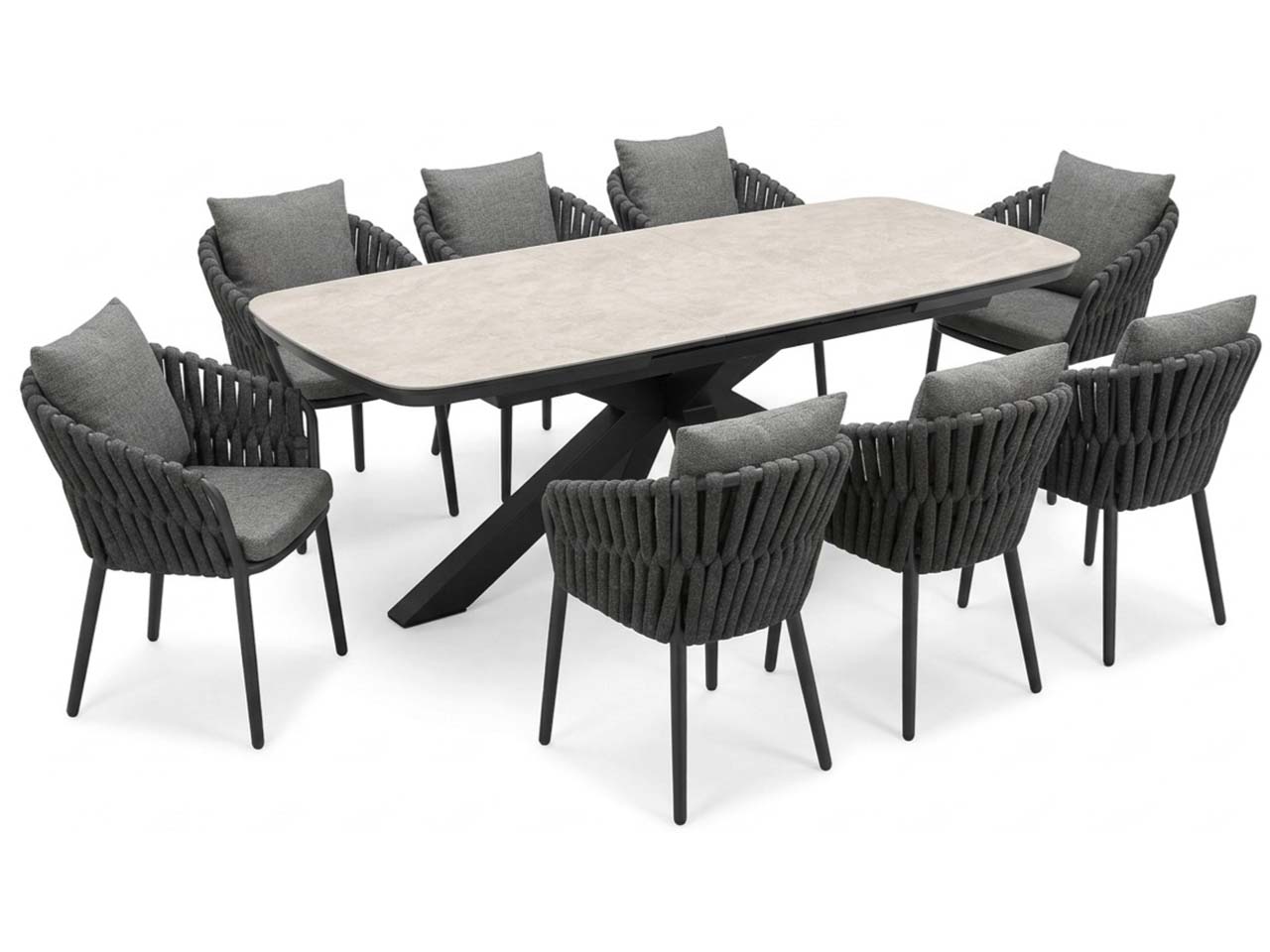Hier ist wirklich Platz für alle! Der ausziehbare Tisch ermöglicht es, dass hier acht Personen gemeinsam zusammensitzen können. Optisch überzeugt das Set mit einer harmonischen Kombination aus elegantem Aluminium und natürlichem Sinterstein. Sinterstein ist ein besonders langlebiges Material aus Quarz und Feldspat, das eine pflegeleichte Alternative zu Marmor darstellt. Es ist UV- und hitzebeständig. Die gemütlichen Gartensessel sind mit einem Rücken- und einem Sitzkissen versehen. Perfekt, um angenehme Stunden auf der Terrasse oder im Garten zu verbringen!