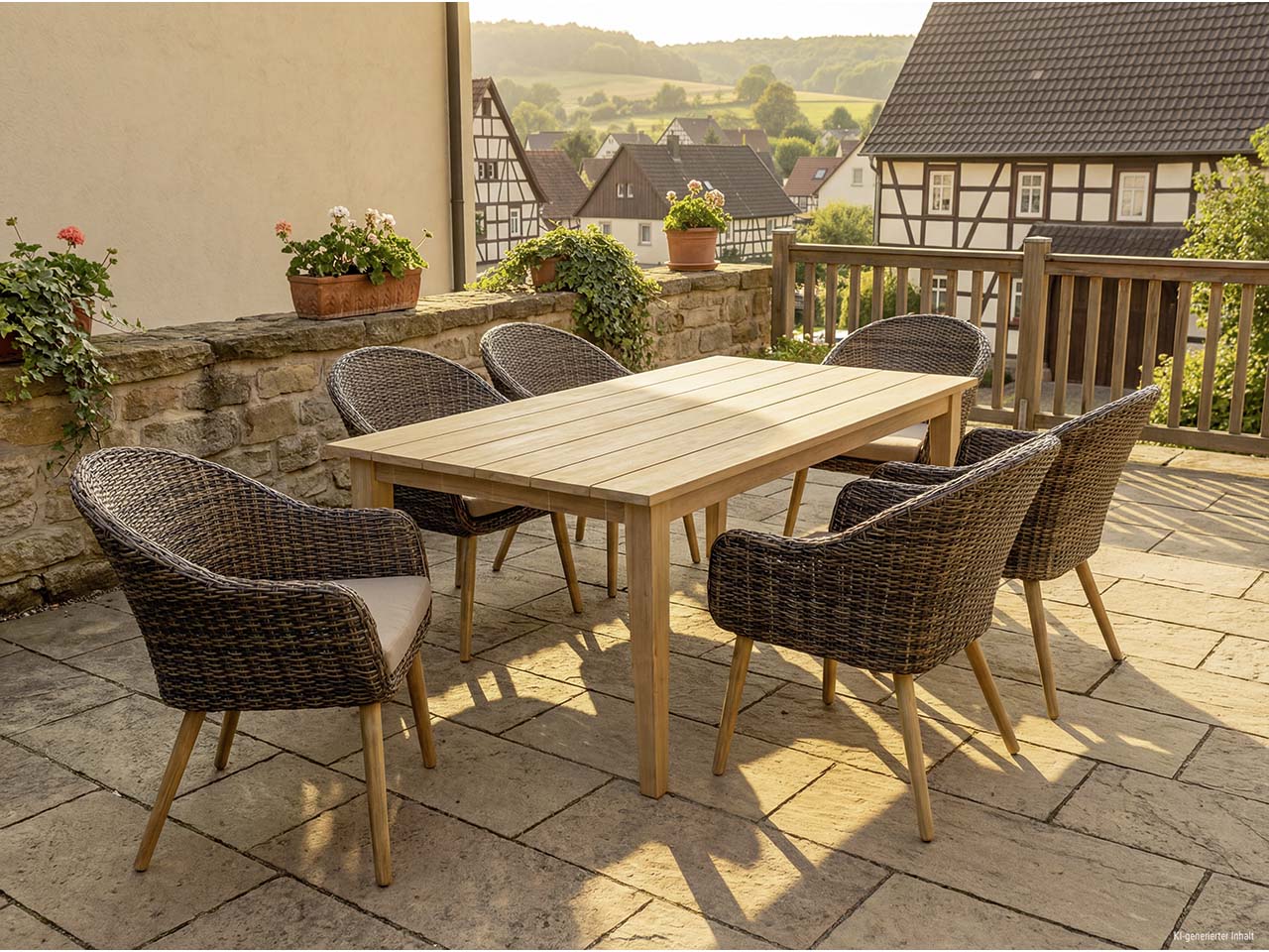 Für alle, die es minimalistisch und rustikal mögen: Das 5-teilige mit rechteckigem Tisch und vier passenden Sesseln mit Armlehnen hat einen ganz natürlichen Charme. Die Tischplatte aus massiver, FSC-zertifizierter Akazie bietet genug Platz für gesellige Runden im Garten oder auf der Terrasse. Die Sessel mit Kunststoffgeflecht-Sitzflächen sind stabil und bequem. Die Sitzauflagen erhöhen den Komfort noch.