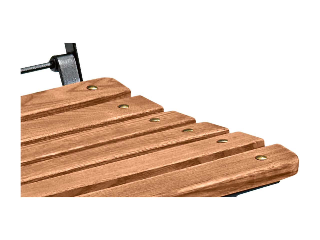Alle Metall- und Beschlagteile sind rostfrei vollverzinkt und schwarz gepulvert, sodass ein interessanter Kontrast zur natürlichen Optik des Holzes entsteht. Der klappbare Stuhl kann platzsparend verstaut werden. Ideal im Winter, wenn die Gartenmöbel im Gartenhäuschen oder -schuppen gelagert werden sollen.