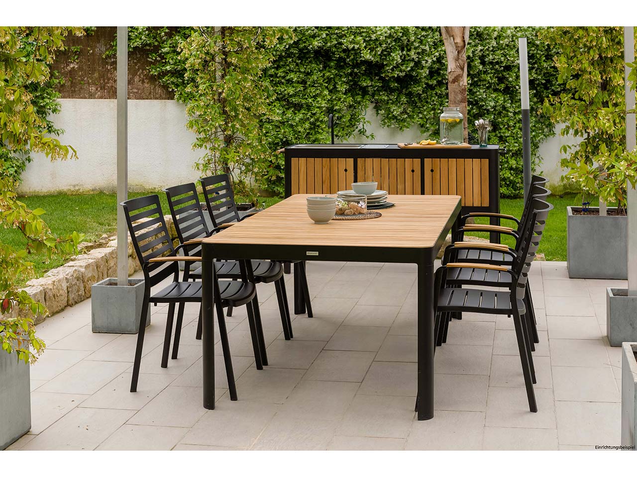 Wann steigt die nächste Gartenparty? Dieser Gartentisch ist auf jeden Fall dabei. Hochwertige Materialien und langlebige, robuste Qualität zeichnen das Möbelstück für den Außenbereich aus. Im Design ist der Gartentisch minimalistisch und gleichzeitig modern gehalten. Die Kombination aus zeitlosem, pulverbeschichtetem Aluminium harmoniert hervorragend mit der Tischplatte aus FSC-zertifiziertem Teakholz. Die sanft abgerundeten Formen wirken besonders harmonisch. An dem Tisch finden bis zu acht Personen Platz. B 209 x T 95 x H 75 cm.