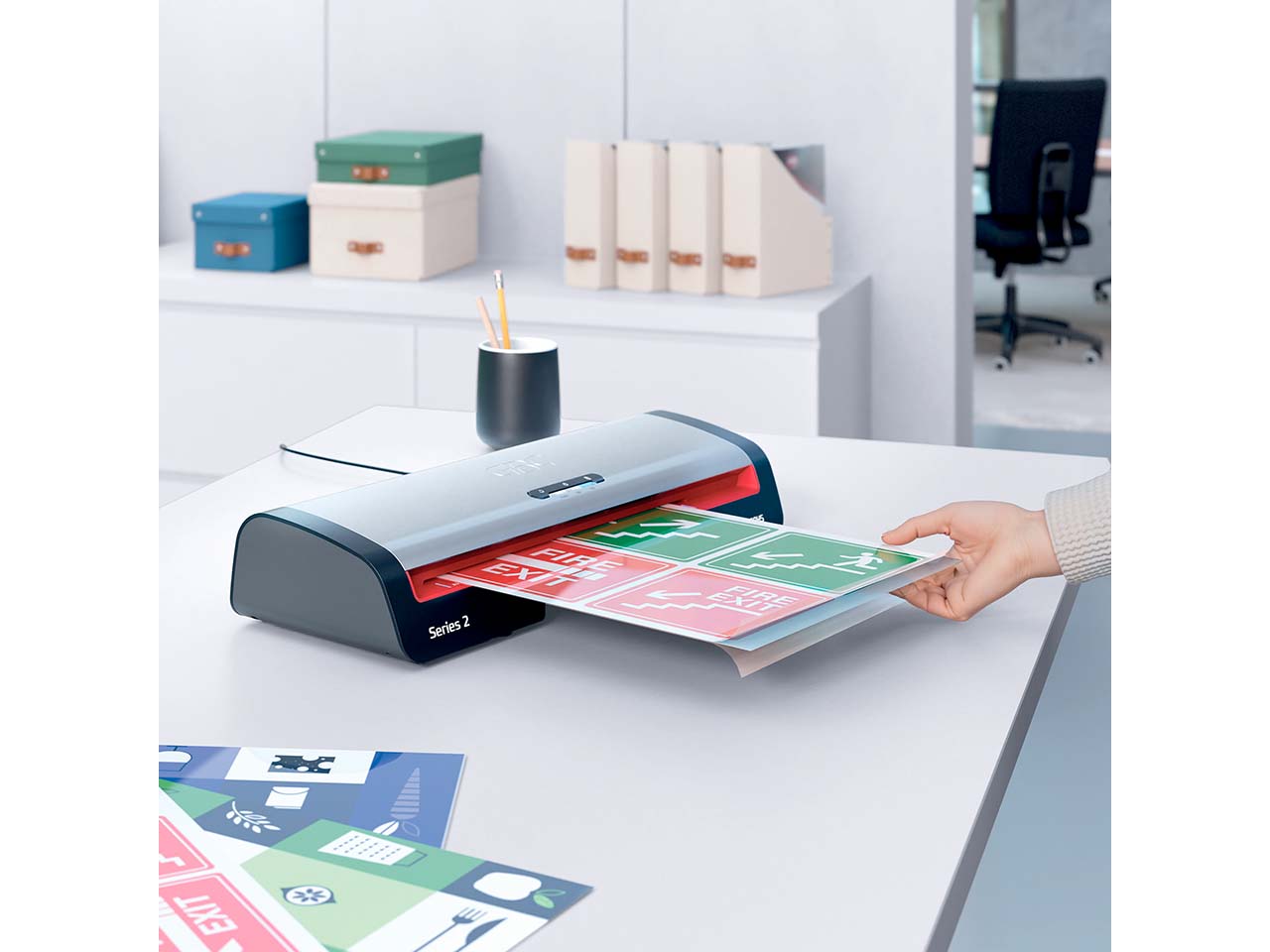 Das A3-Laminiergerät von GBC ist speziell für den Einsatz in professionellen Umgebungen entwickelt und bietet zuverlässige, effiziente Leistung. Es arbeitet mit Höchstgeschwindigkeit, sodass sich die Laminierzeit mit GBC-Hochgeschwindigkeitsfolien um bis zu 33 % reduzieren lässt. Das Laminiergerät wärmt sich innerhalb von einer Minute auf. Über das intuitive Bedienfeld stehen drei Einstellungen für eine Foliendicke von 75 bis 125 Mikron zur Verfügung. Falsch eingezogene Folien lassen sich dank Rücklaufsperrtaste entfernen. Visuelle und akustische Hinweise bietet die SMART-Status-LED. Das GBC Laminiergerät hat einen niedrigen Geräuschpegel und eine 15-minütige Abschaltautomatik. Es eignet sich ideal für die Arbeit im Büro.