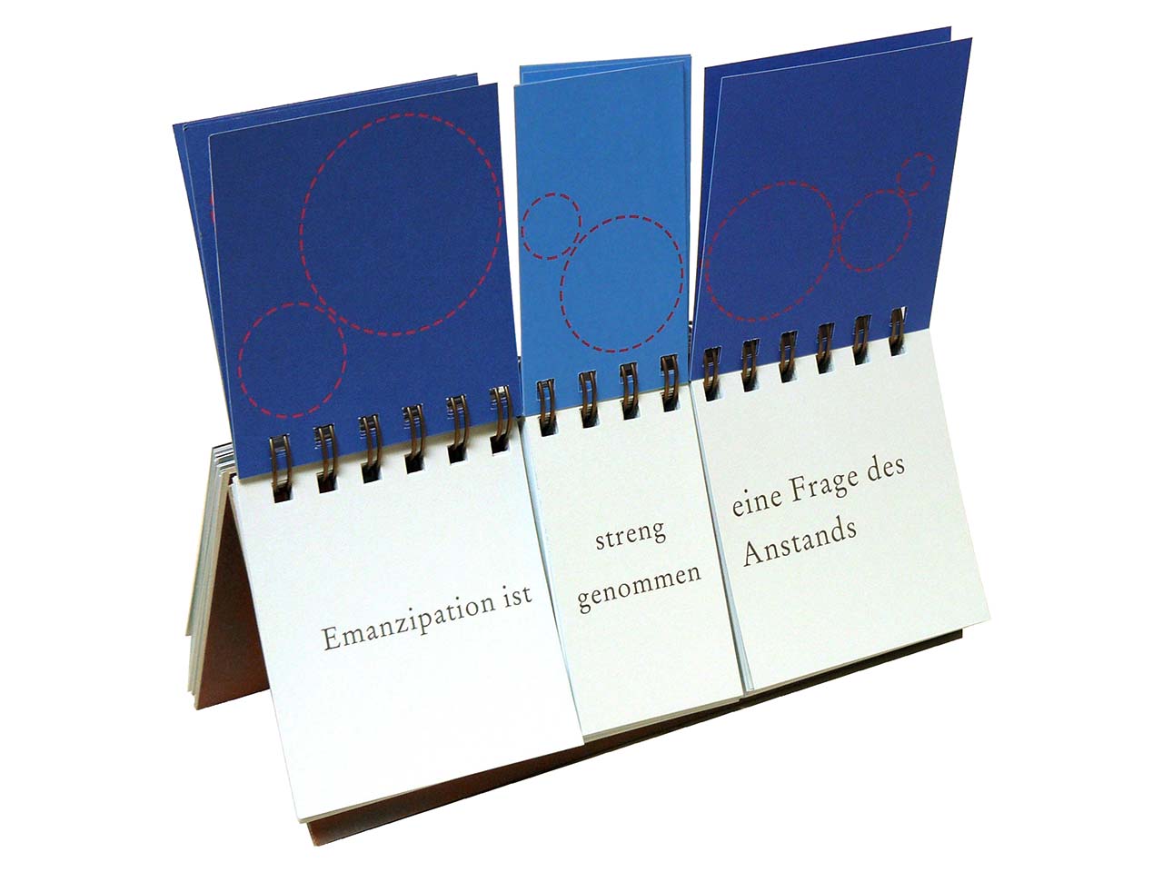 Das Spiel stammt von der Berliner Autorin und Journalistin Pia Frey, die dafür essentielle Themen der Gegenwart neben Adverbien und Eigenschaftsworte sowie Substantive wie Freiheit, Denken, Glück, Religion oder Angst gesetzt hat. So folgt eine streitbare These auf die nächste, mit Sätzen, die absolut zeitlos sind und immer wieder aufs Neue zum Diskutieren einladen.