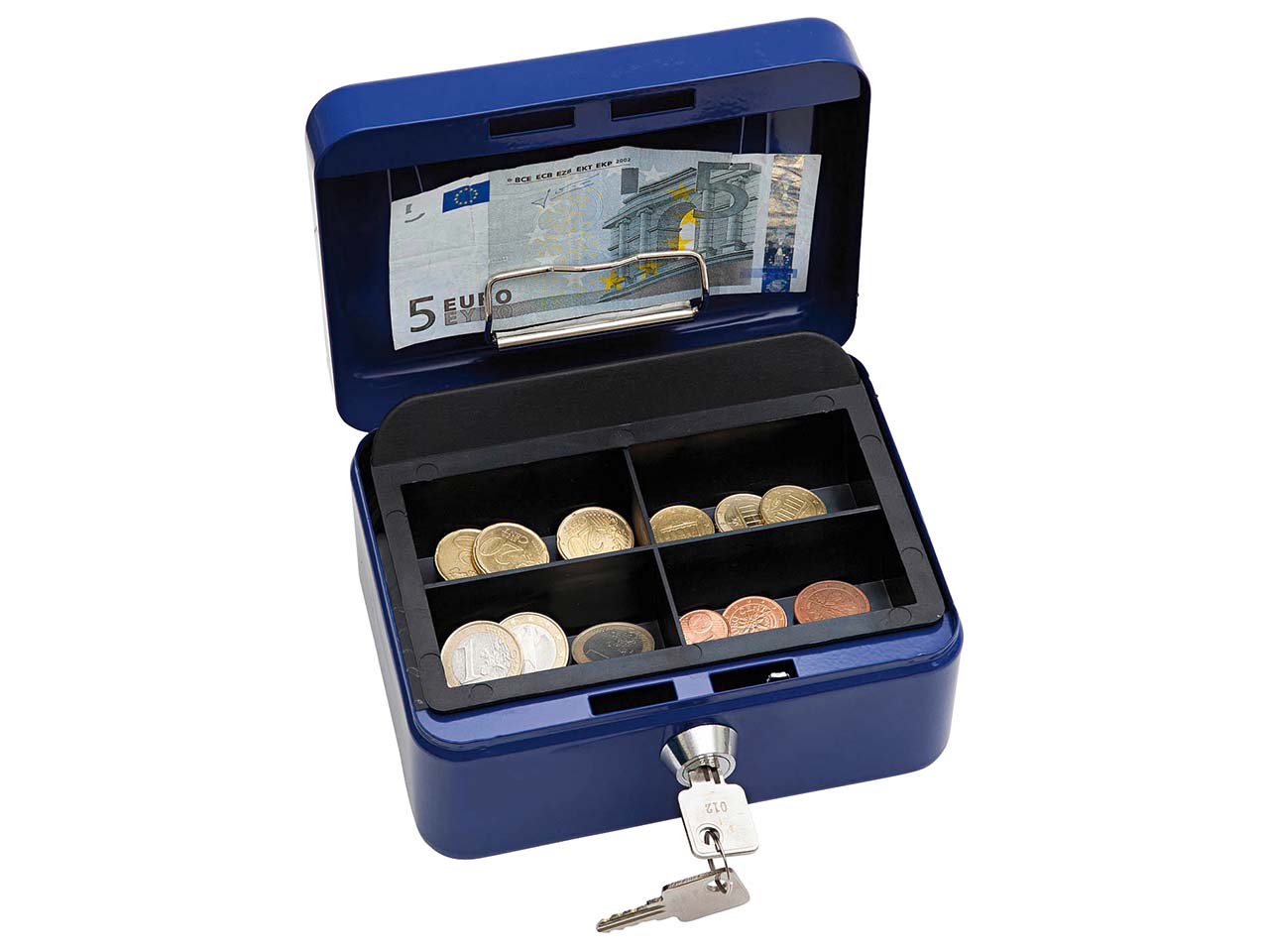 Die Geldkassette ist aus langlebigem Stahlblech gefertigt. Der Münzeinsatz der Geldkassette besteht aus teilweise recyceltem Polystyrol.