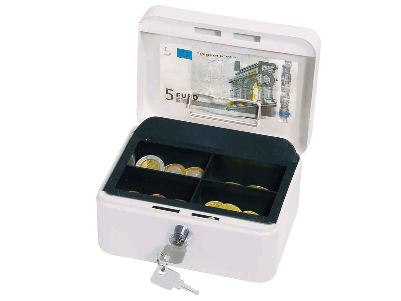 Praktisch und stabil zugleich: Diese Geldkassette aus nahtlos gezogenem Stahlblech ist widerstandsfähig gegen Schlag, Druck und Flammen. Der Münzeinsatz ist aus bruchsicherem Polystyrol gefertigt. In der Deckel-Innenseite befindet sich ein praktischer Metall-Clip zum sicheren Befestigen von Geldscheinen oder Quittungen. Ein vernickelter, im Deckel versenkbarer Tragegriff gewährleistet problemlosen Transport.