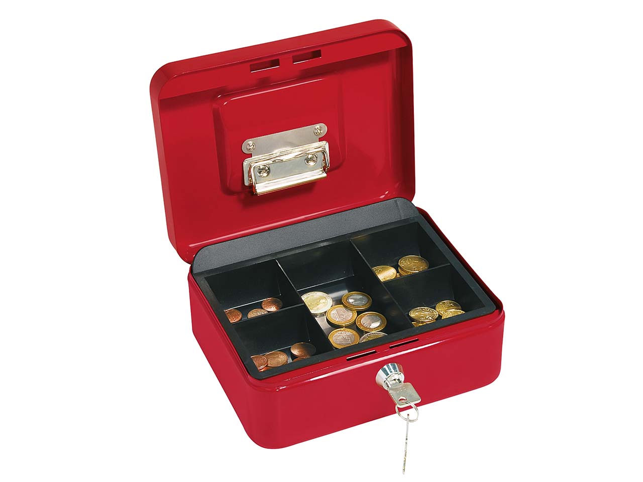 Praktisch und stabil zugleich: Diese Geldkassette aus nahtlos gezogenem Stahlblech ist widerstandsfähig gegen Schlag, Druck und Flammen. Der Münzeinsatz ist aus bruchsicherem Polystyrol gefertigt. In der Deckel-Innenseite befindet sich ein praktischer Metall-Clip zum sicheren Befestigen von Geldscheinen oder Quittungen. Ein vernickelter, im Deckel versenkbarer Tragegriff gewährleistet problemlosen Transport.