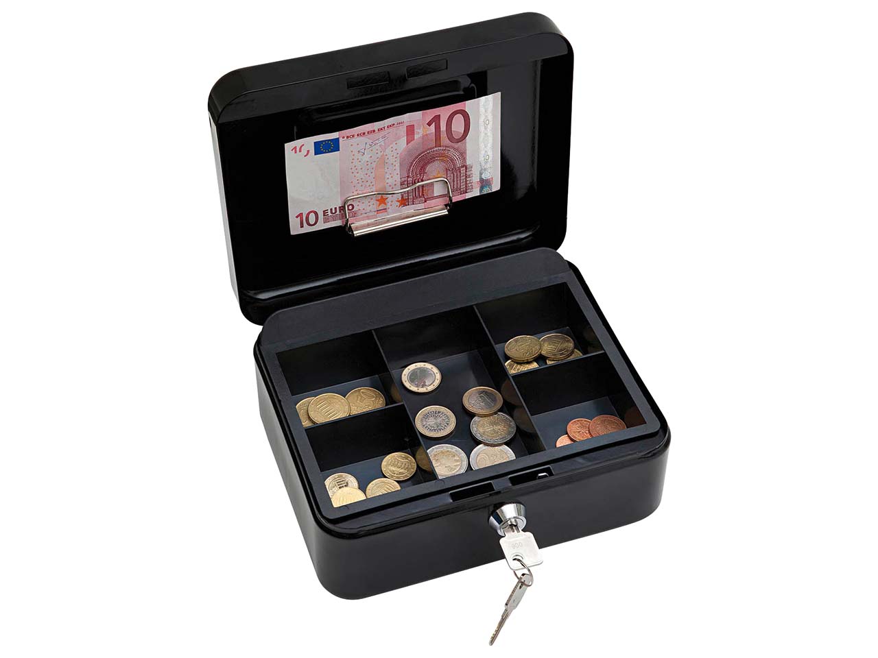 Praktisch und stabil zugleich: Diese Geldkassette aus nahtlos gezogenem Stahlblech ist widerstandsfähig gegen Schlag, Druck und Flammen. Der Münzeinsatz ist aus bruchsicherem Polystyrol gefertigt. In der Deckel-Innenseite befindet sich ein praktischer Metall-Clip zum sicheren Befestigen von Geldscheinen oder Quittungen. Ein vernickelter, im Deckel versenkbarer Tragegriff gewährleistet problemlosen Transport.