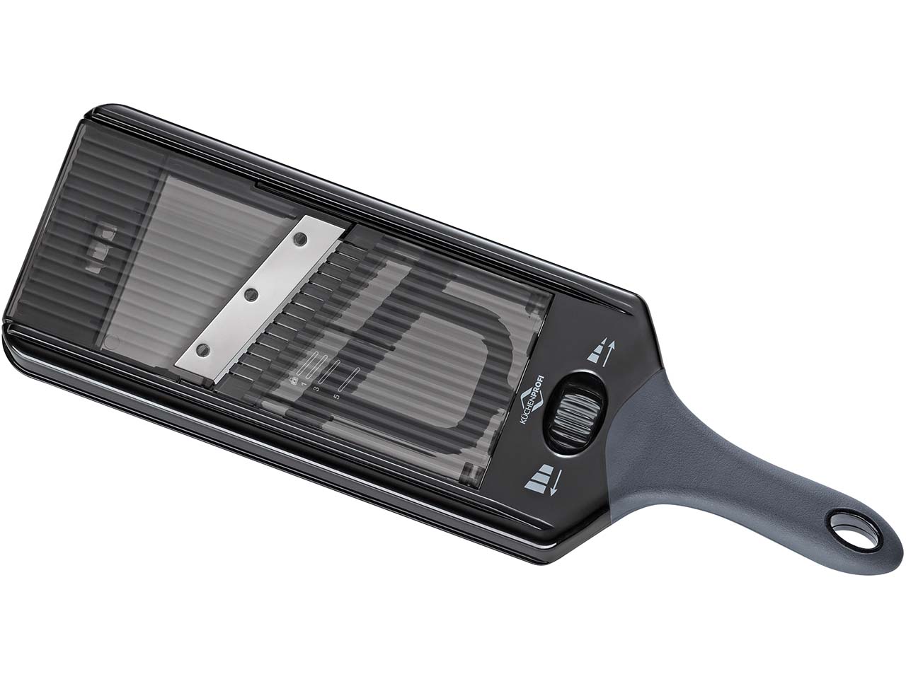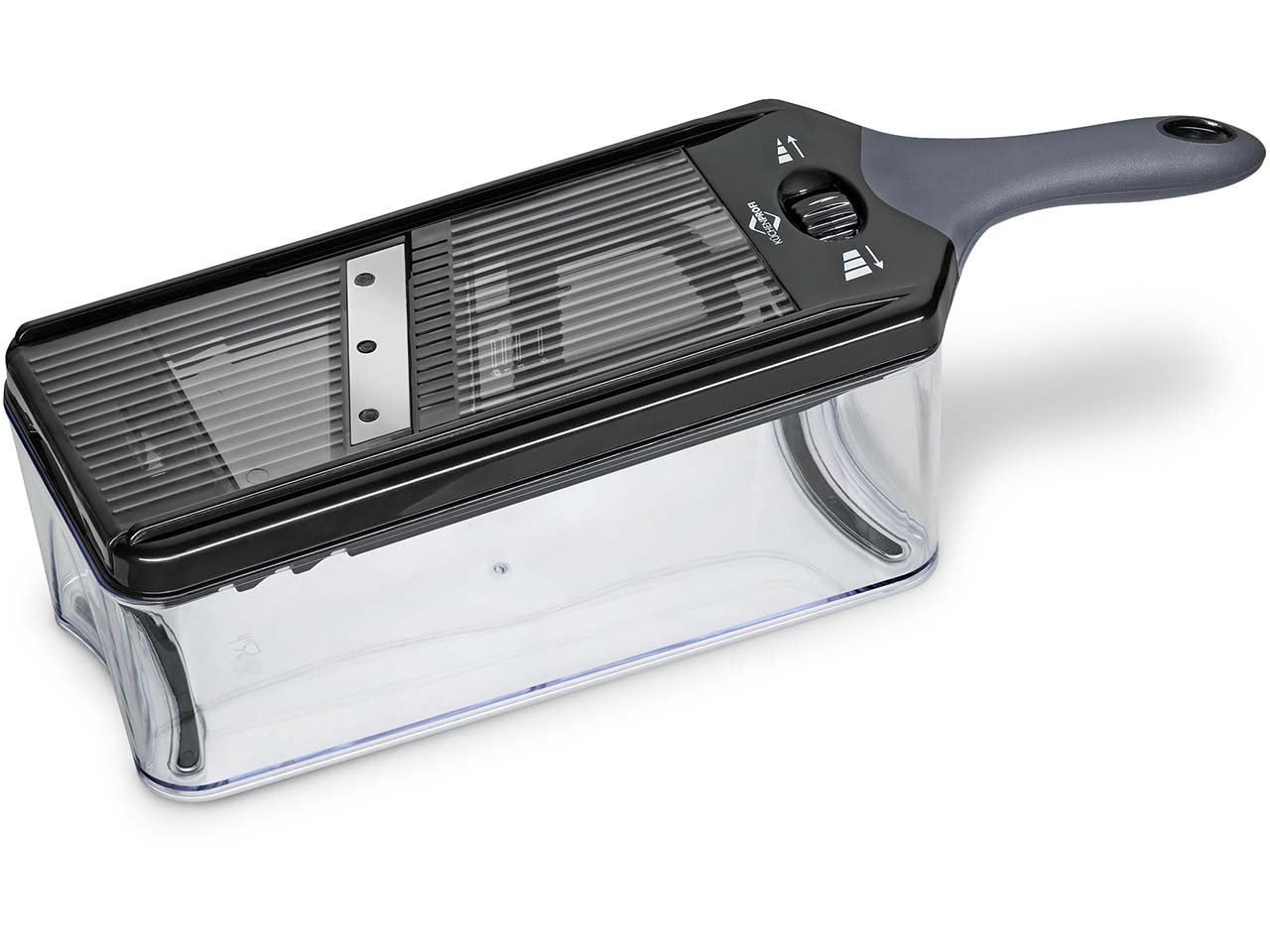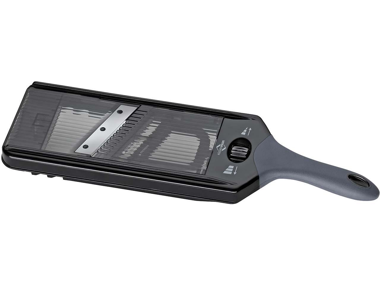 | Inhalt: | Gemüsehobel mit vier Schneideinsätzen (verstellbare Schnittstärke 1-5 mm), Gummierter Griff |