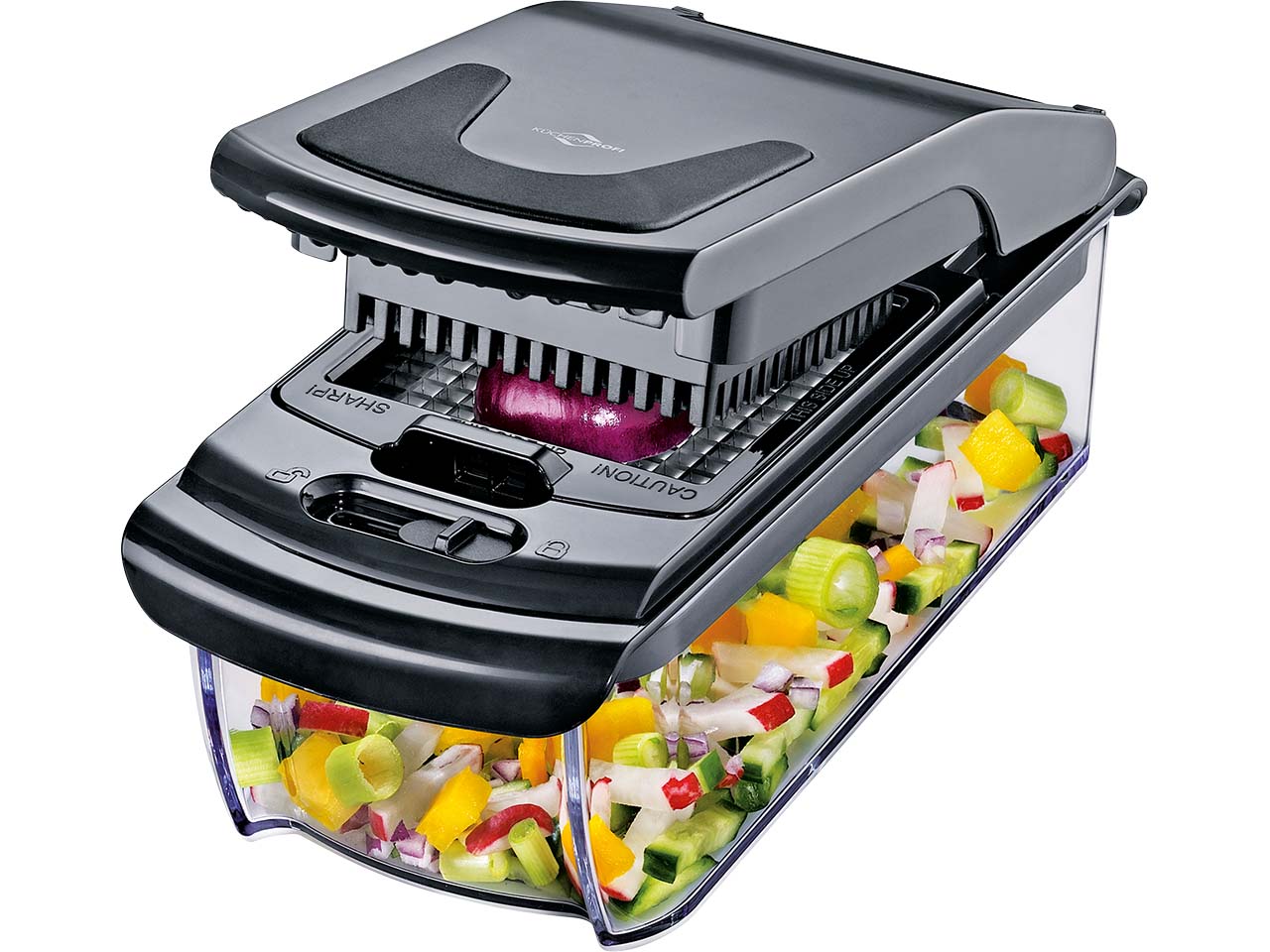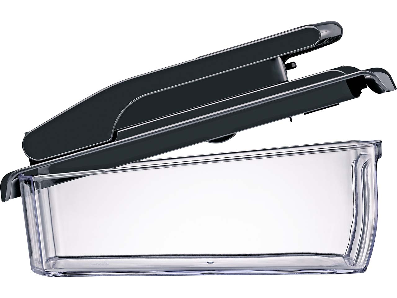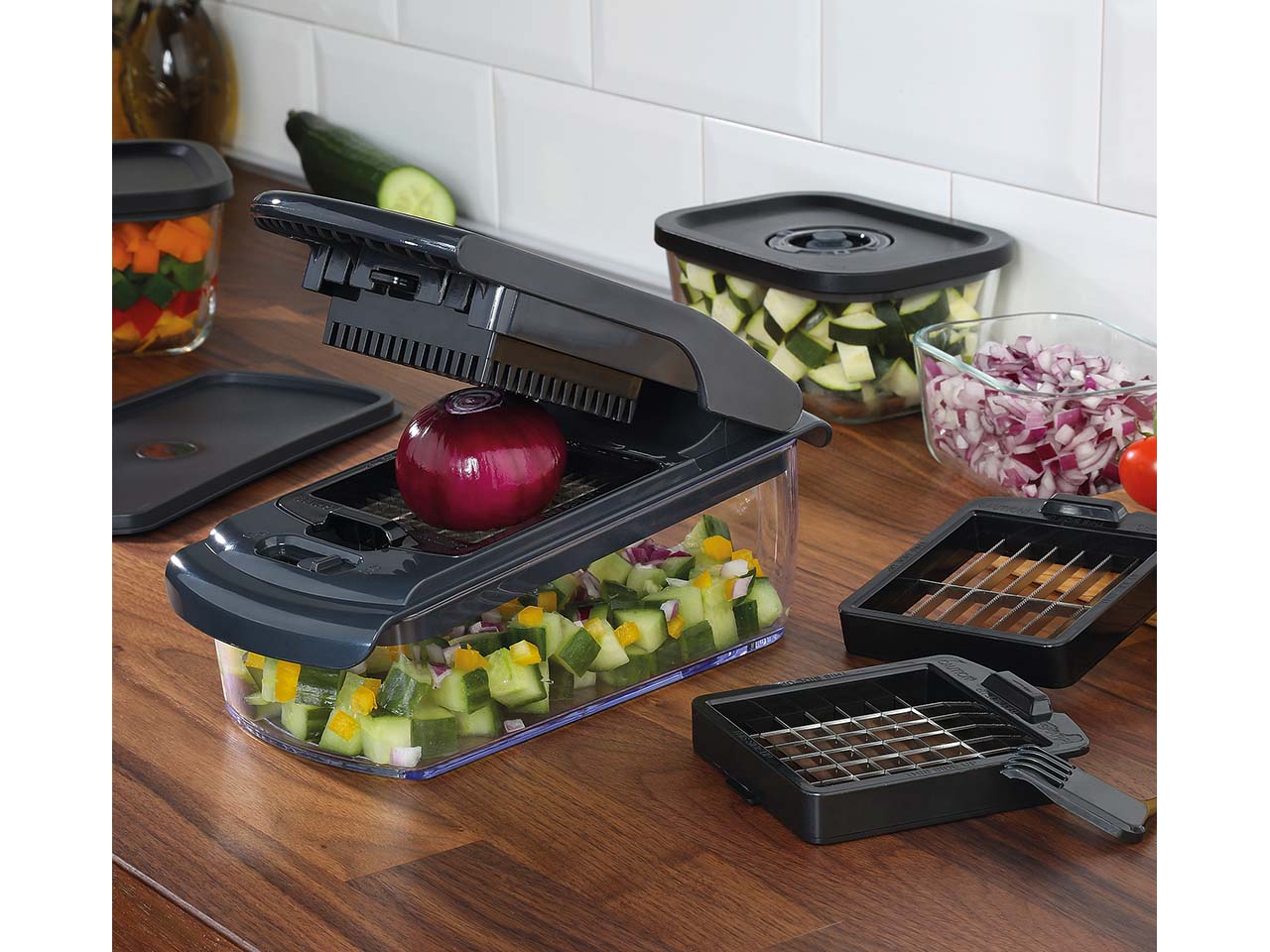 Der Zwiebel- und Gemüsezerkleinerer erleichtert die Küchenarbeit mit drei auswechselbaren Messereinsätzen für feine oder grobe Würfel und Scheiben. Rutschfeste Füße gewährleisten einen sicheren Stand und der Frischhaltedeckel sorgt dafür, dass Gurken, Zwiebeln, Karotten und Co. frisch bleiben. Mit dem Reinigungstool gestaltet sich das Säubern des Küchenaccessoires ganz einfach.
