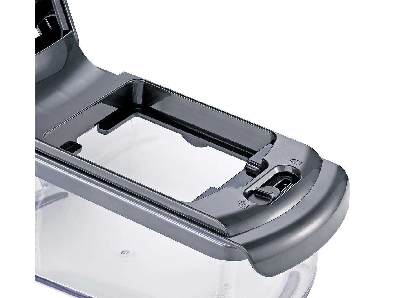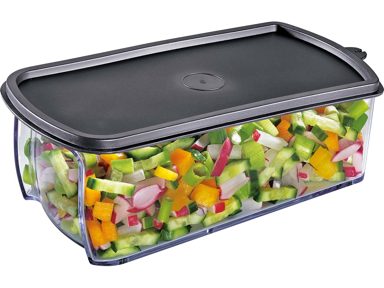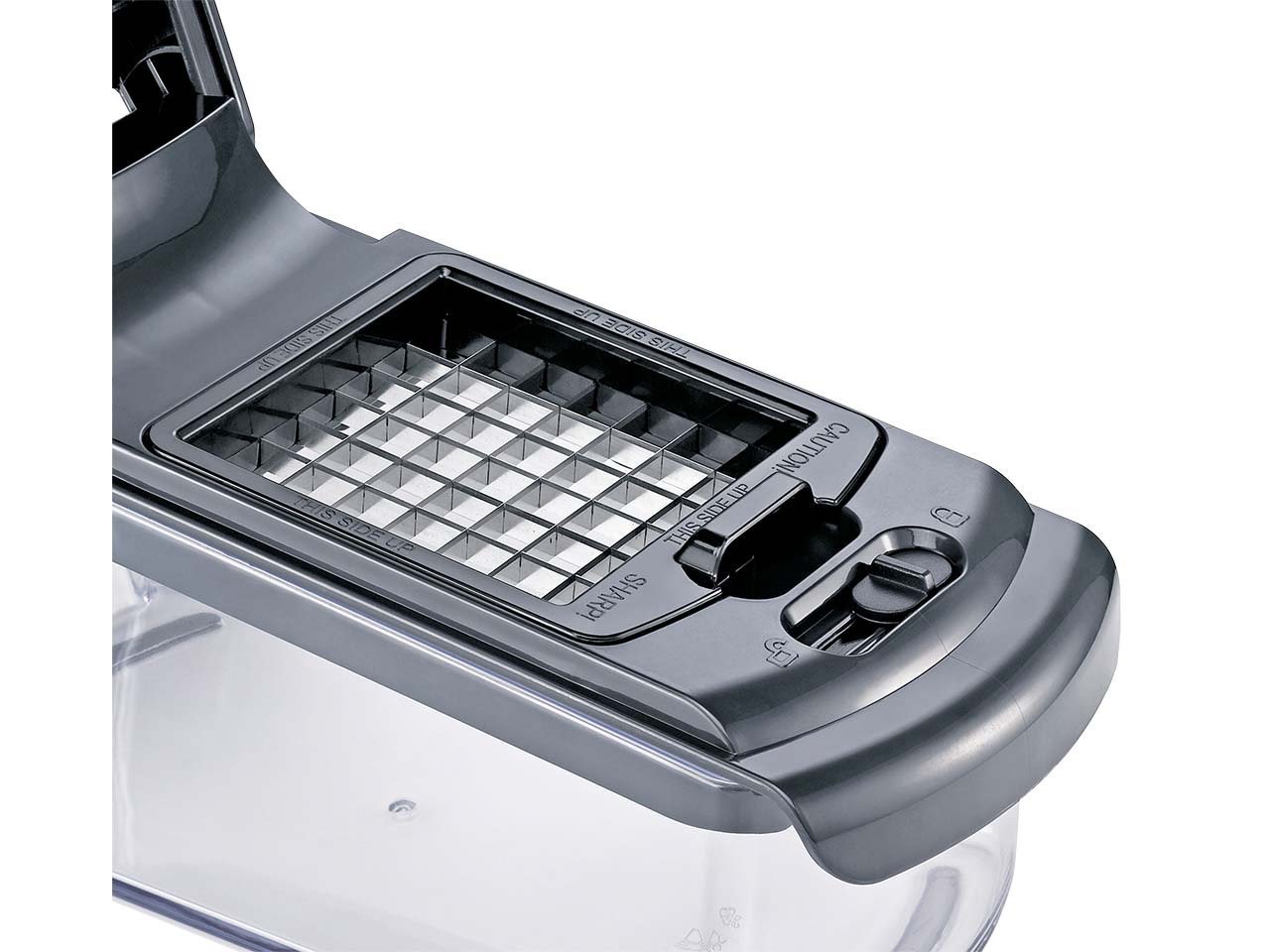 Der Zwiebel- und Gemüsezerkleinerer erleichtert die Küchenarbeit mit drei auswechselbaren Messereinsätzen für feine oder grobe Würfel und Scheiben. Rutschfeste Füße gewährleisten einen sicheren Stand und der Frischhaltedeckel sorgt dafür, dass Gurken, Zwiebeln, Karotten und Co. frisch bleiben. Mit dem Reinigungstool gestaltet sich das Säubern des Küchenaccessoires ganz einfach.