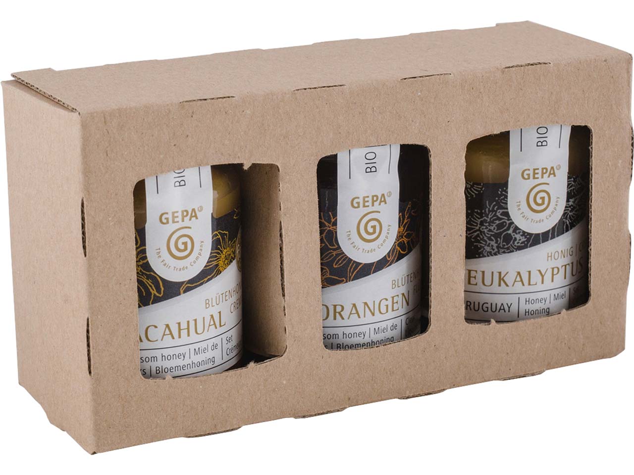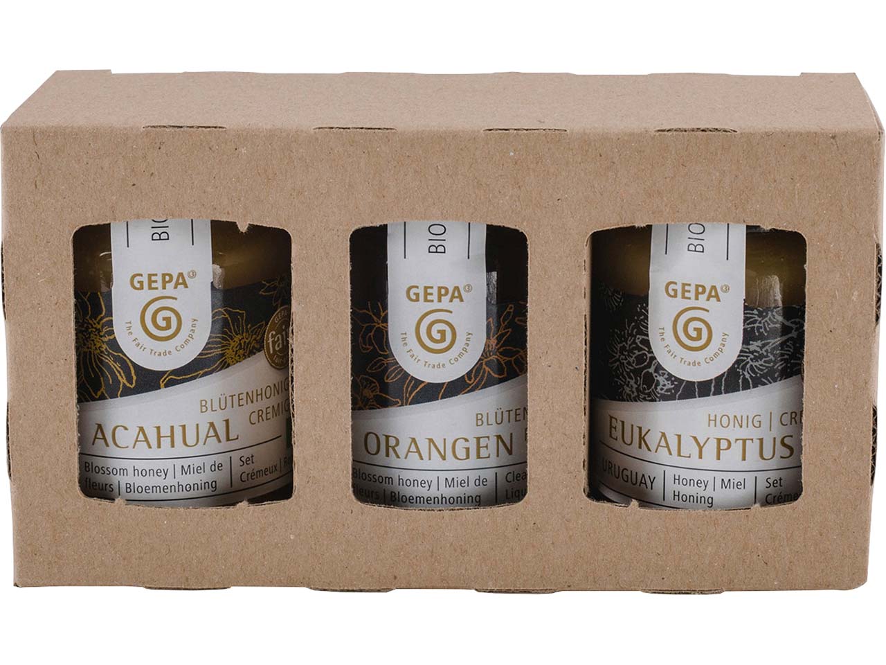 Ein Frühlingsgeschenk mit Geschmack: Dieses köstliche "Trio" von GEPA sorgt als Geschenk- oder Probierset am Frühstückstisch für süßen Genuss. Diese drei Bio-Honigsorten haben Potential die neuen Lieblingsaufstriche zu werden. Der Eukalyptus-Honig aus Uruguay erinnert mit seinem würzig-intensivem, kräftigen Aroma an Kräuter und ist so ein wahres Geschmackserlebnis. Wer es lieber cremig und blumig-vanillig mag, greift zum Acahual-Blütenhonig. Der biologische Sortenhonig aus Mexiko schmeckt ganz typisch nach der wilden Acahual-Blüte und ist mit seiner intensiv gelben Farbe auch optisch ein Highlight. Mild-blumiger Geschmack zeichnet den Orangenblütenhonig aus, der mit feinem Aroma und sanftem Duft überzeugt. Der flüssige Sortenhonig wird von Bienen überwiegend auf Orangenblüten gesammelt. Alle Honigsorten stammen aus fairem Handel und sind zu 100 % ökologisch angebaut. Inhalt 3 x 125 g.