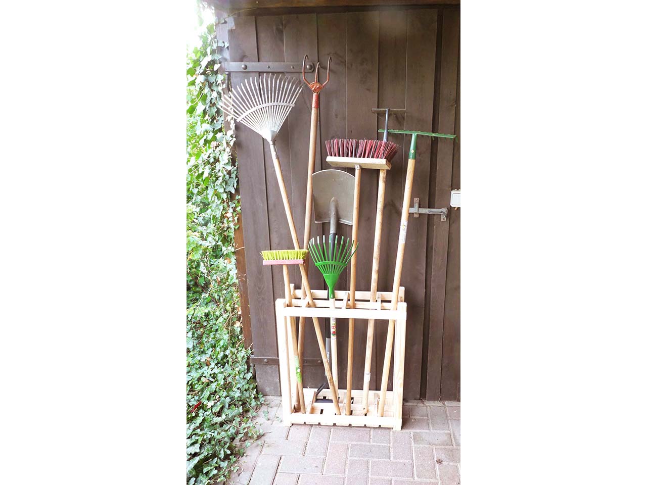 Der stabile, universale Geräteständer aus unbehandeltem, massivem Kiefernholz eignet sich optimal für Schuppen oder Gerätehaus. Die Einteilung ist variable, sodass Sie fast jedes Werkzeug darin lagern können. Die Gartenutensilien sind so immer griffbereit. B 60,2 x T 21,8 x H 70 cm.
