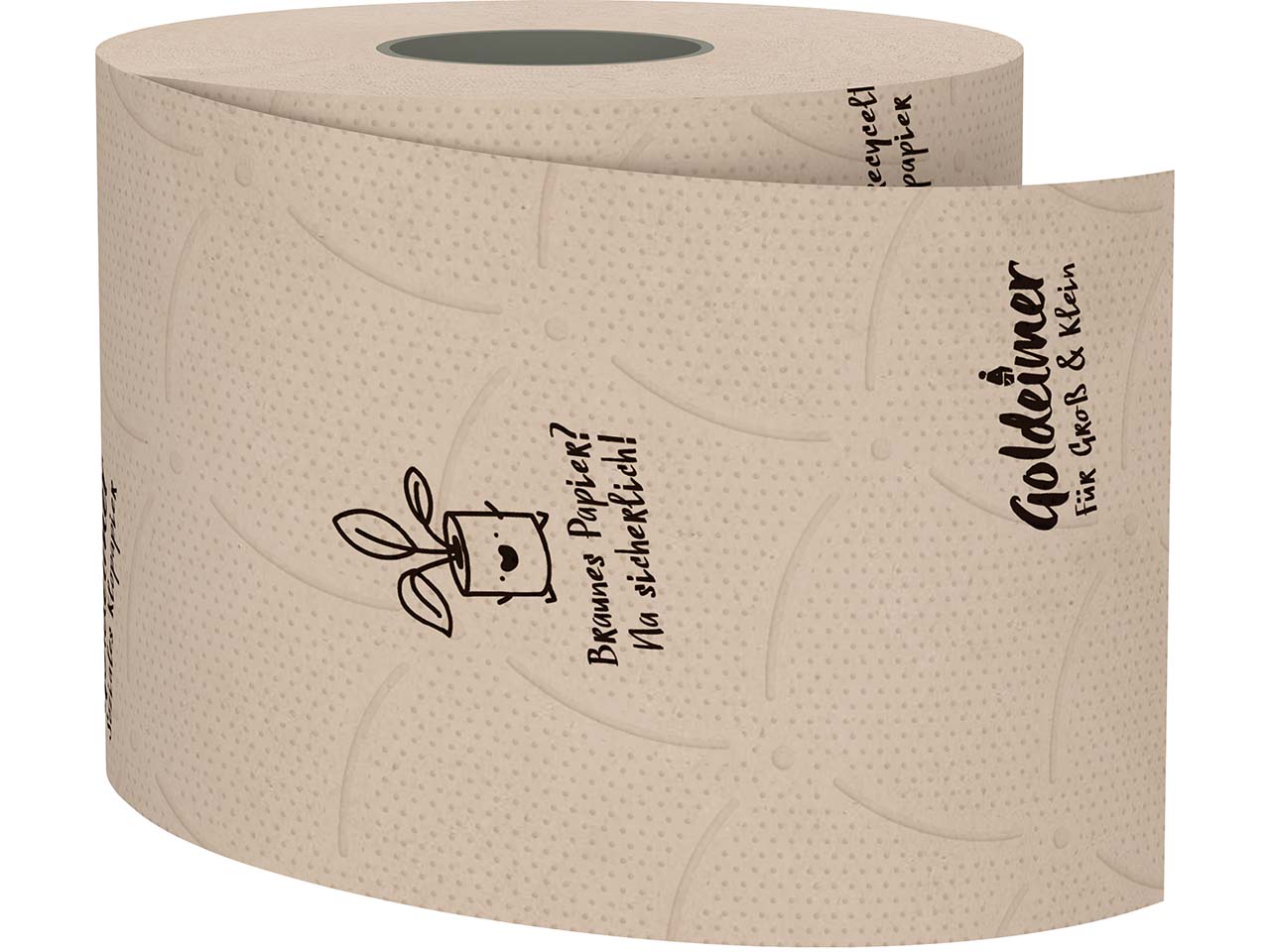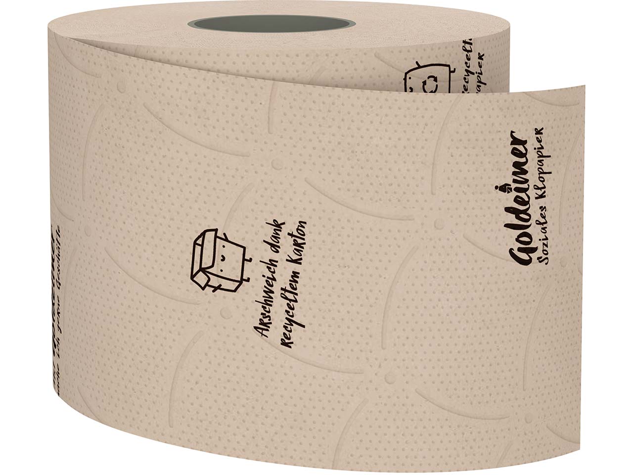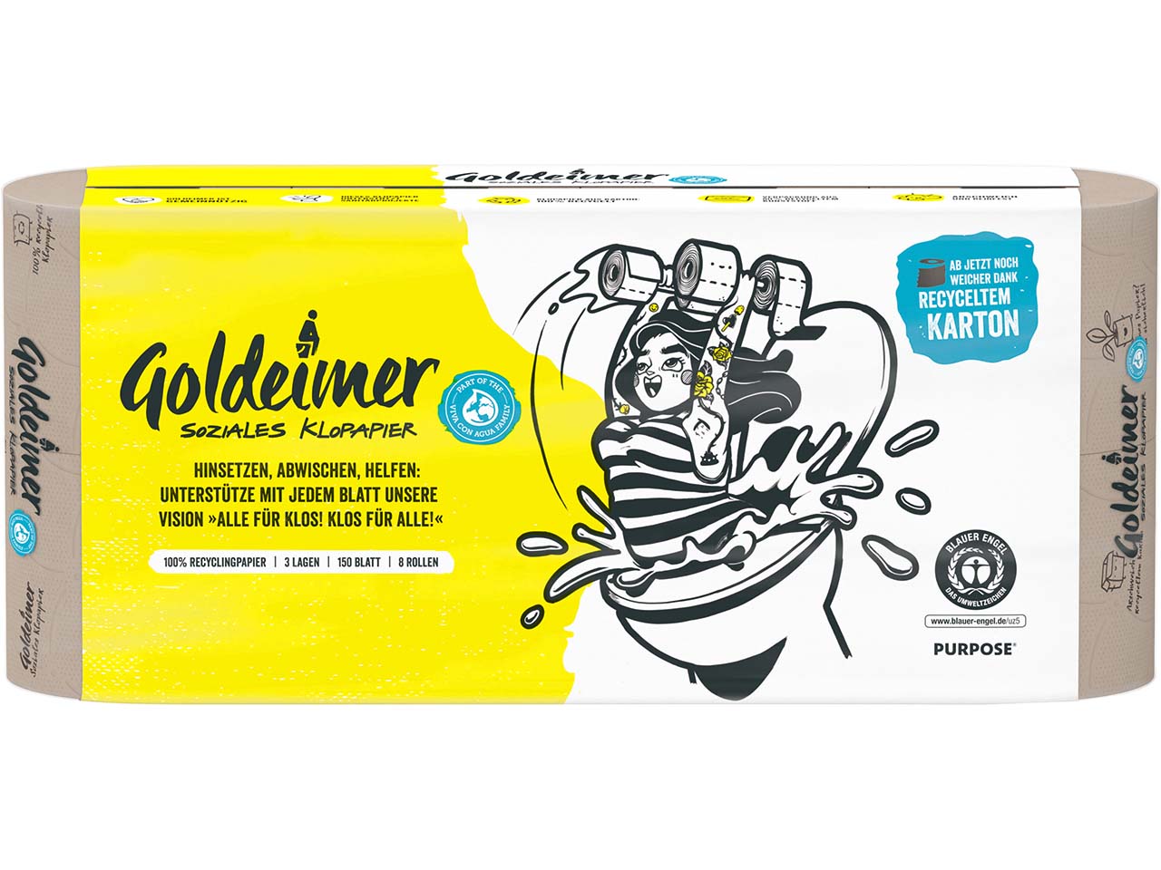 Das soziale Toilettenpapier von Goldeimer steht für die Vision „Alle für Klos! Klos für Alle!“. Toiletten sind eine Grundvoraussetzung für ein würdevolles, hygienisches Leben, aber 3,6 Milliarden Menschen haben keinen Zugang zu einer gesicherten Sanitärversorgung. Auf diesen Umstand macht jede Packung und jede Rolle Goldeimer Hygienepapier aufmerksam. Mit dem Verkauf werden Einnahmen für Sanitärprojekte sowie Bildungs- und Aufklärungsarbeit weltweit generiert. Das Toilettenpapier ist aber nicht nur sozial, sondern auch nachhaltig und funktional: Hergestellt wird das mit dem Blauen Engel ausgezeichnete Papier aus ungebleichter, recycelter Kartonage. Durch die Verwendung von recyceltem Karton ist das 3-lagige Toilettenpapier jetzt sogar noch weicher! Jede Rolle hat 150 Blatt.
