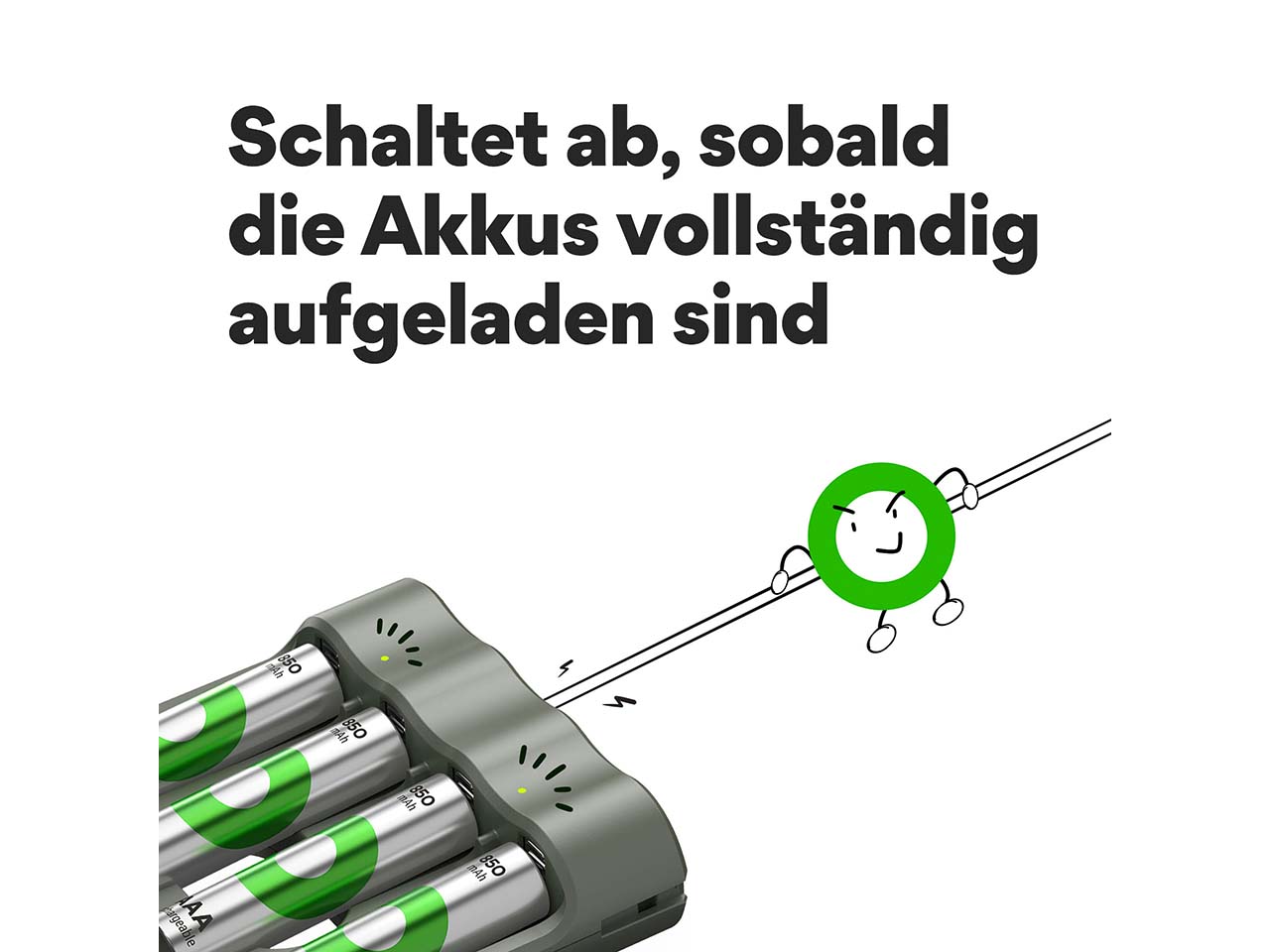 - Kompaktes Ladegerät inkl. 4 x AAA-Akkus