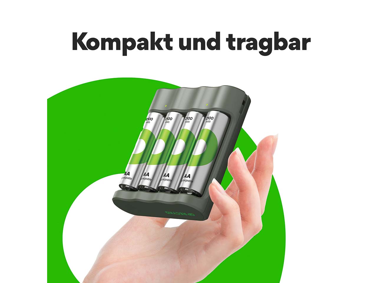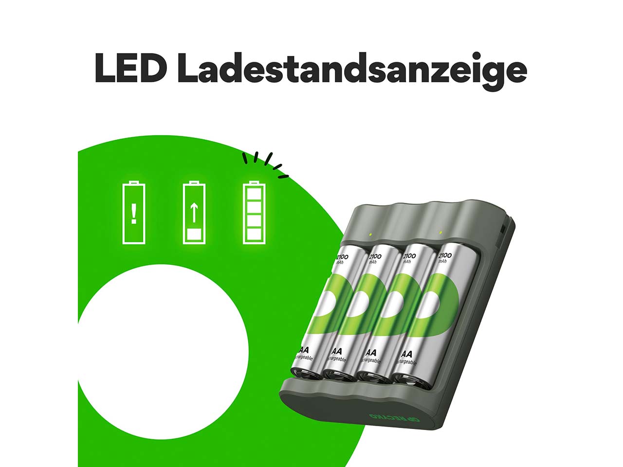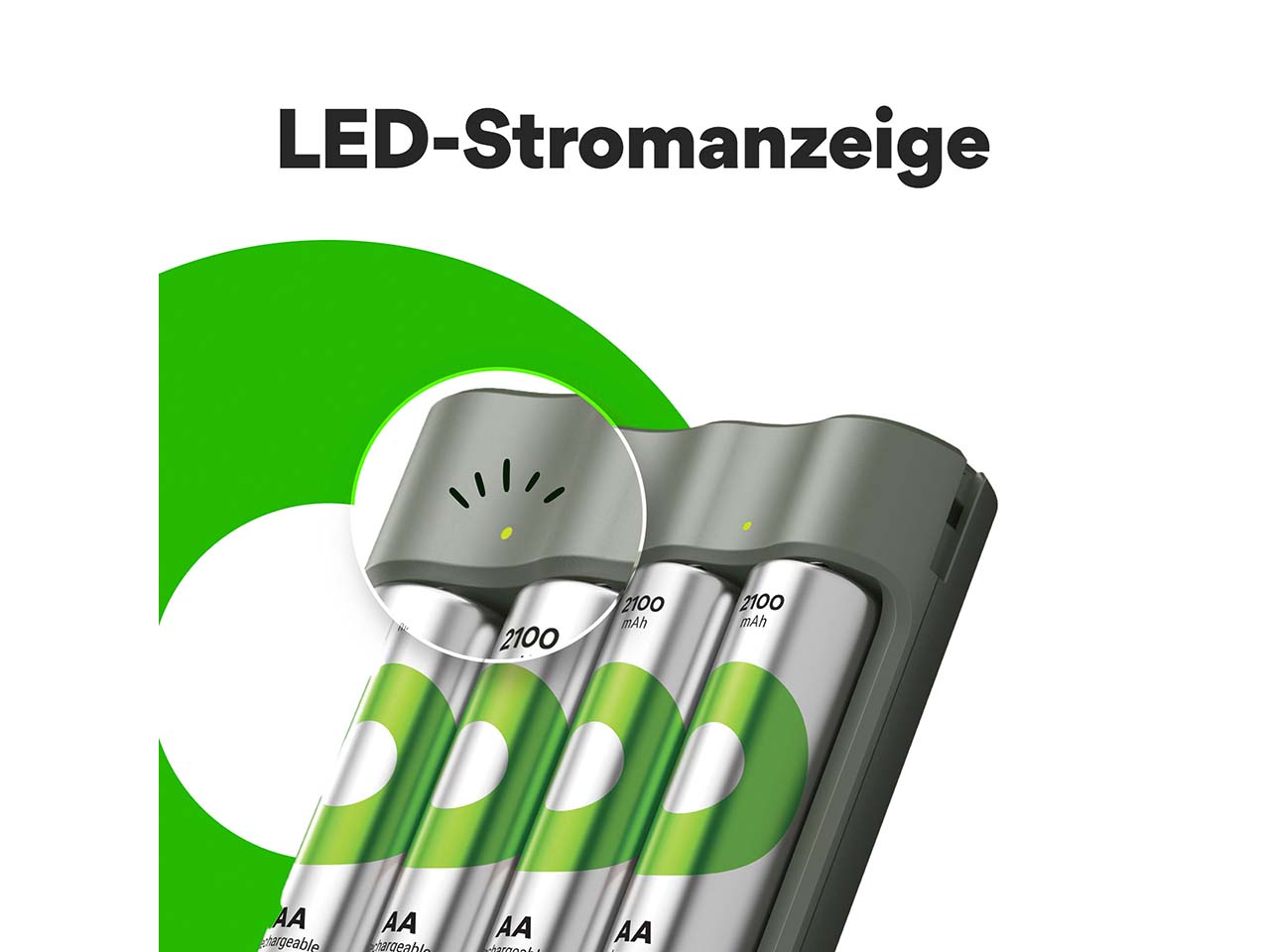 - Kompaktes USB-Ladegerät inkl. 4 AA-Akkus mit je 2100 mAh
