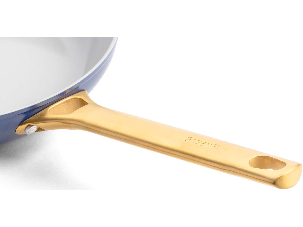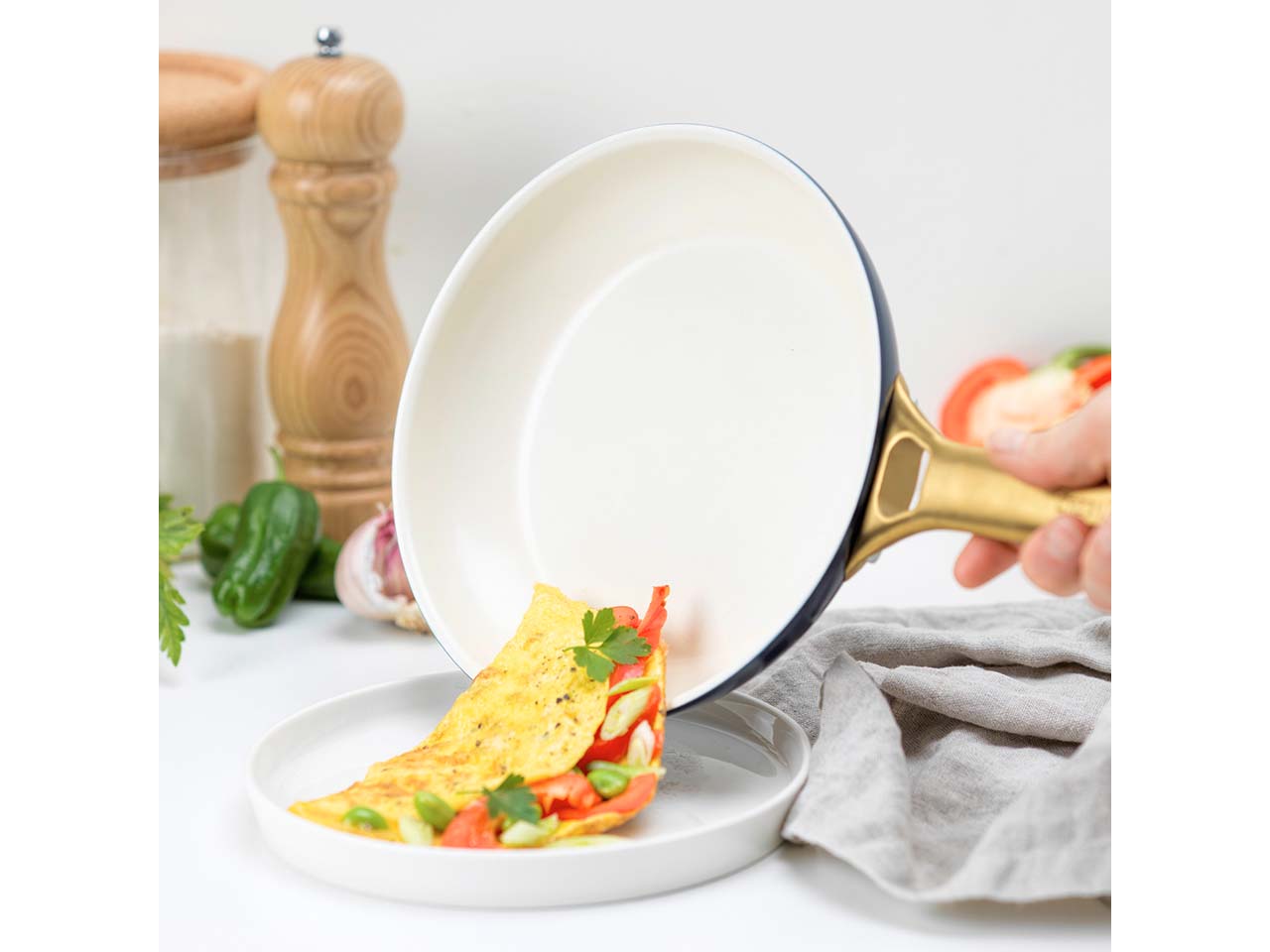 Diese hochwertigen, luxuriösen Bratpfannen aus geschmiedetem Aluminium und Griffen aus goldbeschichtetem Edelstahl sind die beste Wahl für alle, die perfekte Ergebnisse in der Küche erzielen wollen. Die stilvollen, langlebigen Pfannen haben eine diamantverstärkte, PFAS-freie Antihaftbeschichtung und eignen sich für alle Herdarten inklusive Induktion. Durch die zwei verschiedenen Größen können die Pfannen für eine Vielzahl von Zubereitungen verwendet werden. Sie sind sogar bis 200 °C ofenfest!