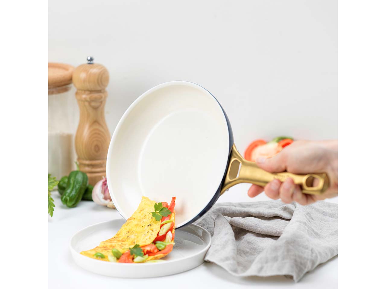 Das perfekte Set für alle, die auf Perfektion und Luxus in der Küche setzen: Die Bratpfannen und Töpfe aus geschmiedetem Aluminium haben Griffe aus goldbeschichtetem Edelstahl und eignen sich für alle Herdarten inklusive Induktion. Das stilvolle, langlebige Kochgeschirr hat eine diamantverstärkte, PFAS-freie Antihaftbeschichtung, die auf einem Sandderivat basiert. Die verschiedenen Größen ermöglichen vielseitige Zubereitungsmöglichkeiten, z.B. zum Braten oder Dünsten und zum Kochen. Die vier Deckel aus gehärtetem Glas sind wie das Kochgeschirr ofenfest bis 200 °C.