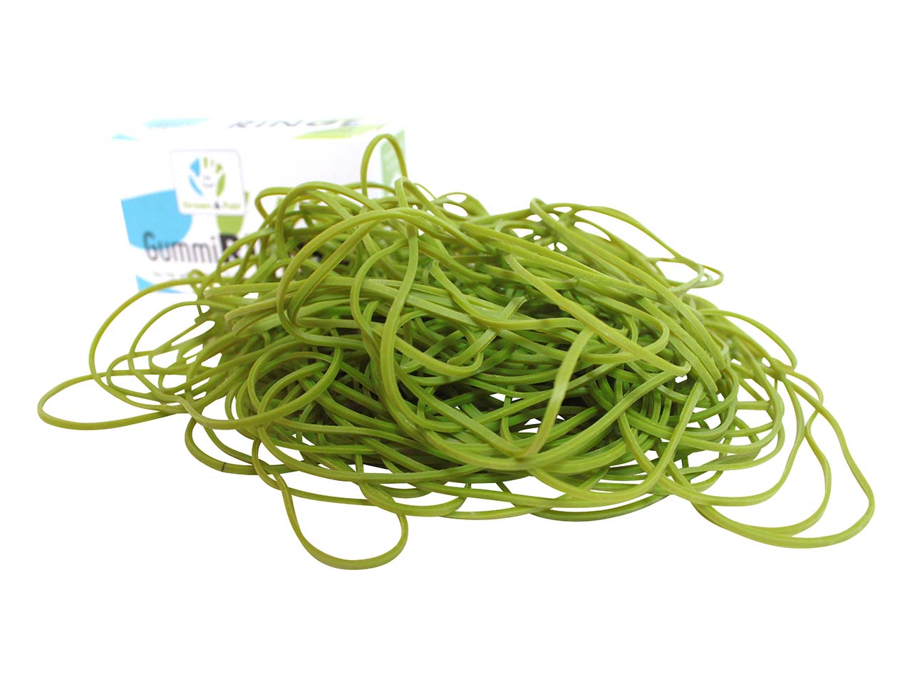 Die Gummiringe "Green & Fair" ergänzen jedes Büro und jeden Haushalt. Die Kautschukgewinnung folgt den strengen Standards des FSC und Fair Rubber. Für jedes Kilo Kautschuk werden Fairtrade-Prämien bezahlt. Die Gummis sind besonders elastisch, extrem reißfest und behalten auch nach mehrfacher Benutzung eine hohe Spannkraft. In verschiedenen Ausführungen erhältlich. Inhalt pro Schachtel 50 g. Farbe grün.