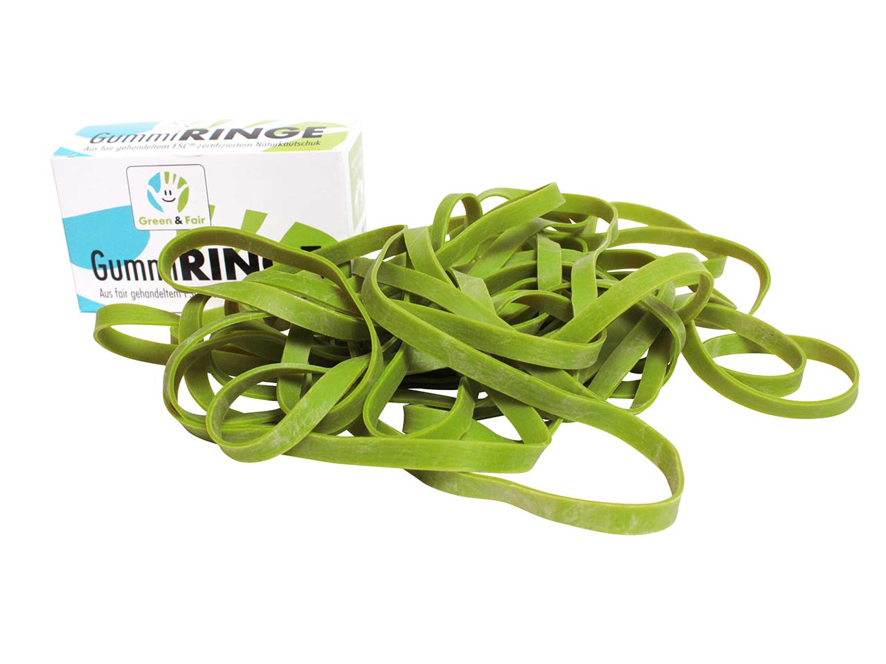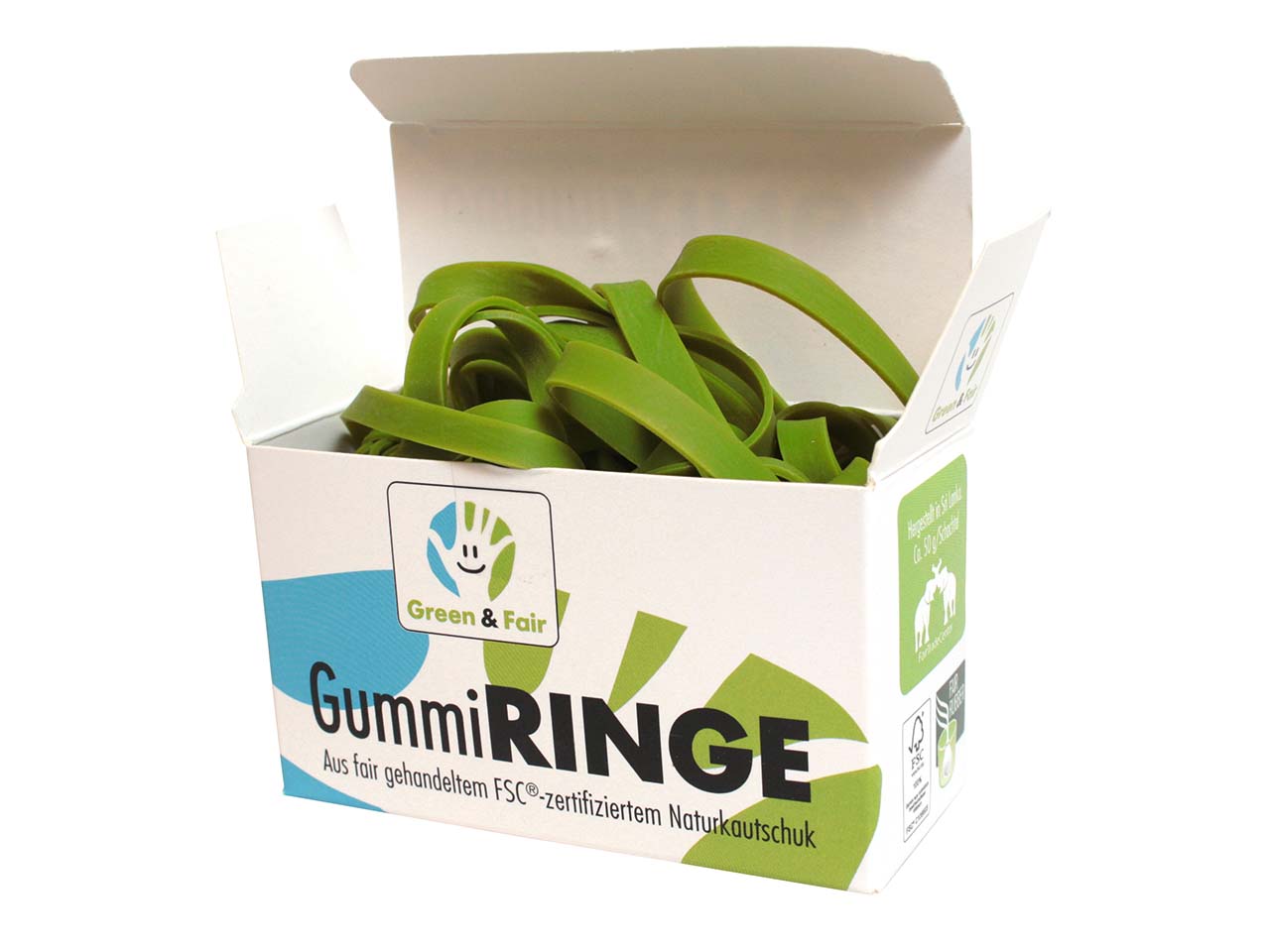 Die Gummiringe "Green & Fair" ergänzen jedes Büro und jeden Haushalt. Die Kautschukgewinnung folgt den strengen Standards des FSC und Fair Rubber. Für jedes Kilo Kautschuk werden Fairtrade-Prämien bezahlt. Die Gummis sind besonders elastisch, extrem reißfest und behalten auch nach mehrfacher Benutzung eine hohe Spannkraft. In verschiedenen Ausführungen erhältlich. Inhalt pro Schachtel 50 g. Farbe grün.