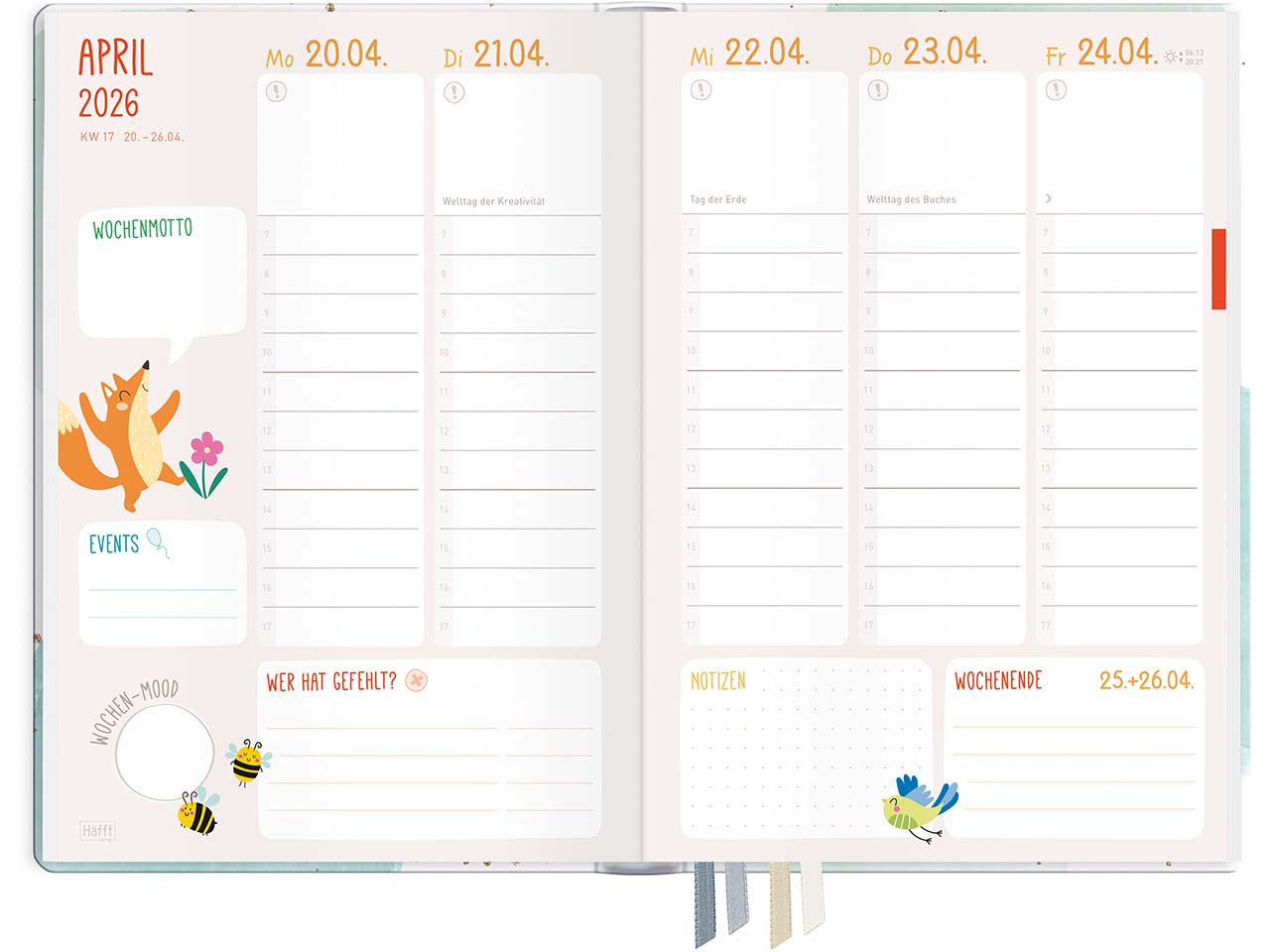 - Wochenkalendarium mit Stundeneinteilung von 7 bis 17 Uhr