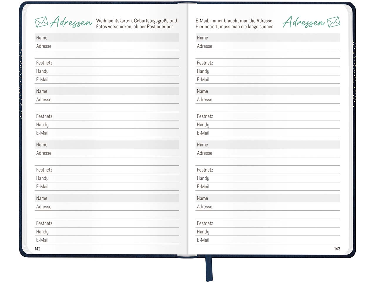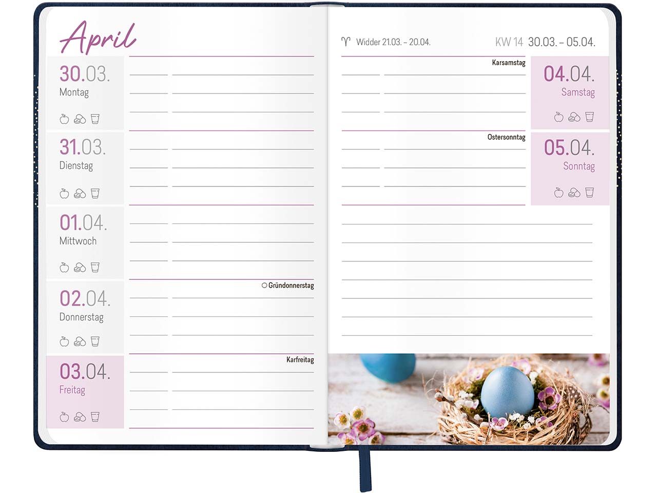 Die Großdruckschrift macht diesen Planer zu einem treuen Begleiter im Alltag. Der lese- und schreibfreundliche Kalender mit großen Zahlen hilft dabei, Urlaub, Termine und alles Wichtige immer im Blick zu behalten. Stimmungsvolle Farbfotos und Sprüche lockern die Atmosphäre auf. Auf Sonderseiten finden sich Notruf- und Servicenummern für Polizei, Apotheke und mehr. Eine Übersicht über Arzt-, Vorsorge- und Kontrolltermine hilft, den Überblick zu behalten. Eine Checkliste für Verträge und Abos, Listen für Rezepte und Geschenkideen runden den Planer perfekt ab. Weitere Highlights sind die doppelseitige Monatsübersicht und die Erinnerungen, Medikamente einzunehmen und genug zu trinken. Der Kalender mit einer Woche auf zwei Seiten hat ein kratzfestes Hardcover und ein Lesezeichen.