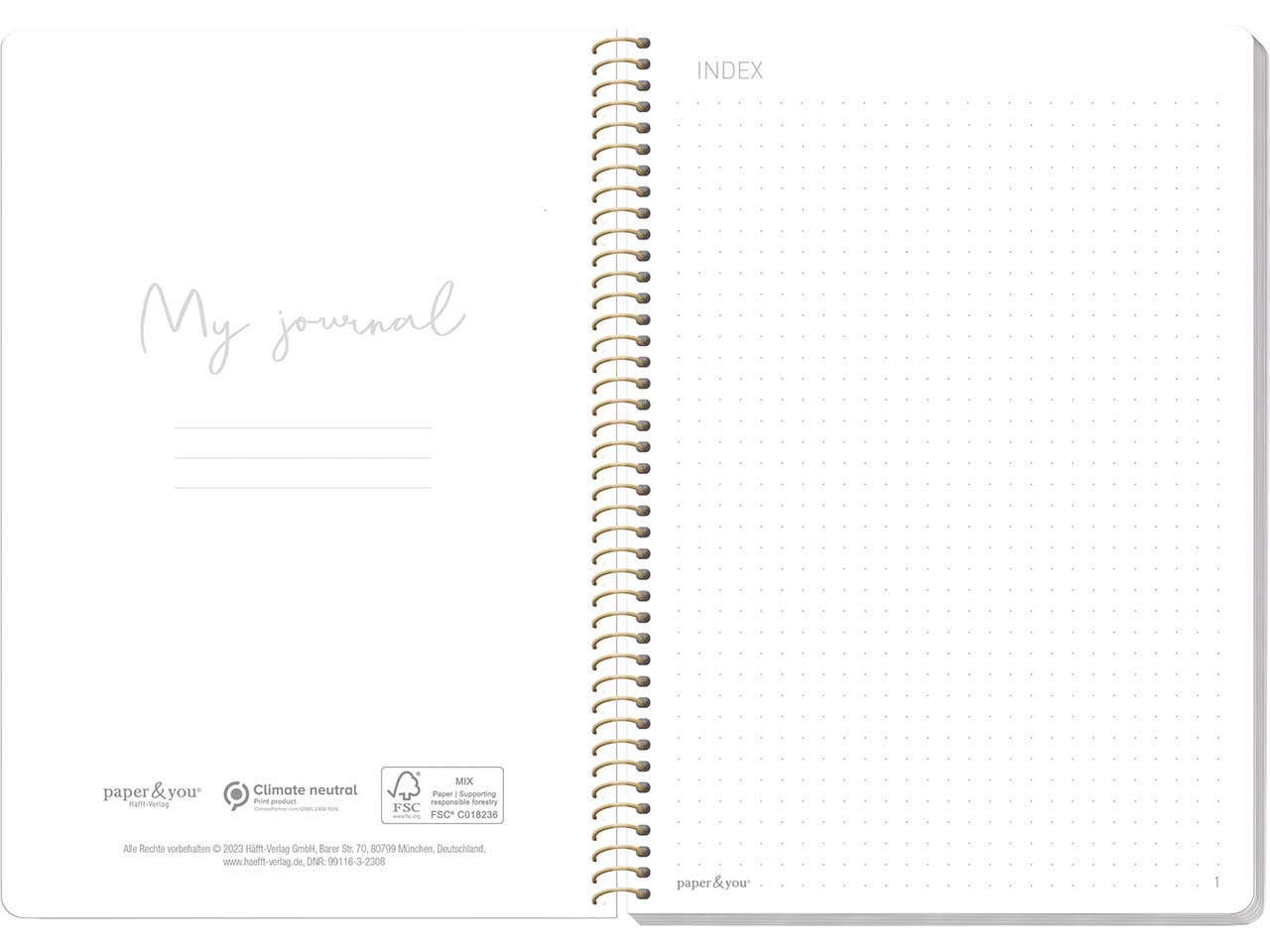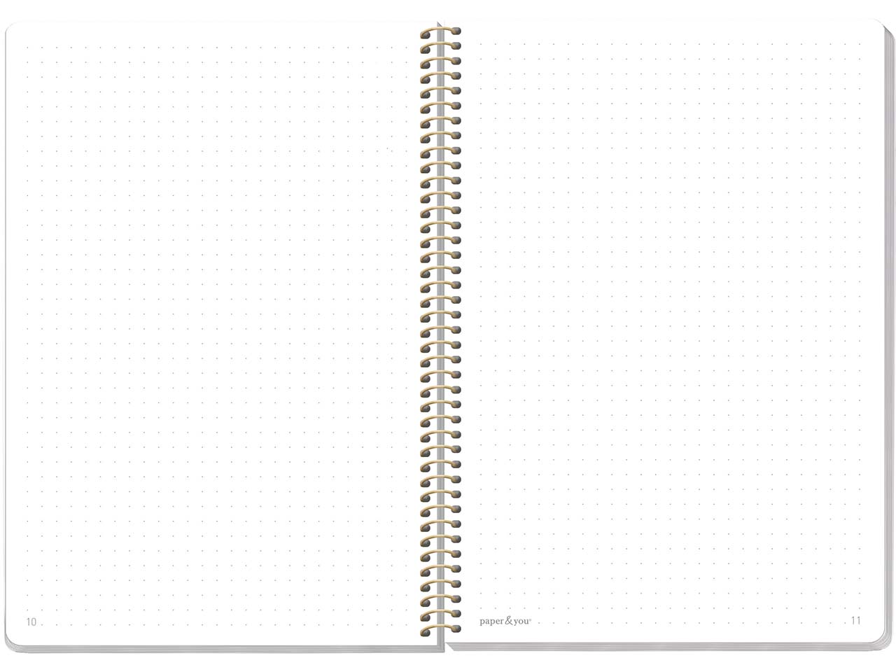 Der perfekte Begleiter für den Alltag: Das dotted Journal bietet Platz für Skizzen, Pläne, Ideen, Gedanken, Bullet Journaling oder Handlettering. Das kompakte Format ermöglicht die einfache Mitnahme in fast jeder Tasche. Dank Spiralbindung liegt das Notizbuch im geöffneten und gefalteten Zustand immer flach auf dem Tisch. Das Premium-Papier aus verantwortungsvoller Forstwirtschaft ist für verschiedene Stiftarten geeignet und lädt dazu ein, kreativ zu sein.