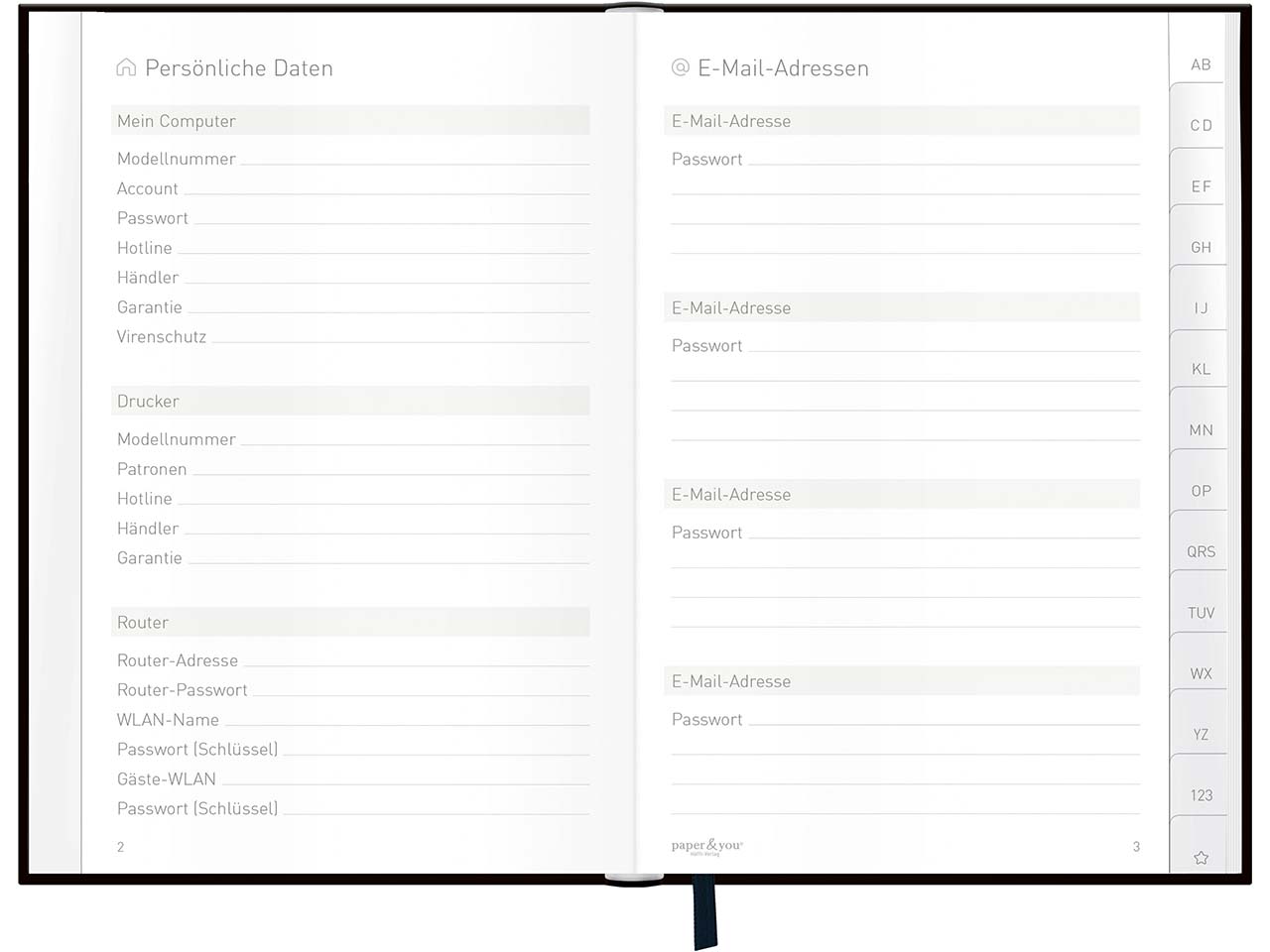 In diesem Büchlein sind Passwörter optimal organisiert! Das Register von A–Z sowie Zahlen bietet Platz für bis zu 320 Einträge. Hier können Passwörter für z.B. Online-Accounts, Streaming-Dienste und Co. diskret aufbewahrt werden. Extraseiten mit Tipps zur Passwortsicherheit, Computer- und Bankdaten machen den Passwort-Organizer zu einem praktischen Begleiter im Alltag. Hardcover, Gummiband und Lesezeichen unterstreichen das hochwertige, durchdachte Design. Das Premium-Papier stammt aus verantwortungsvoller Forstwirtschaft.