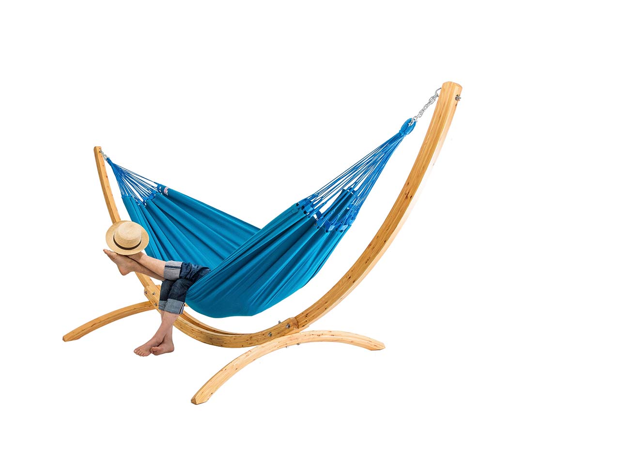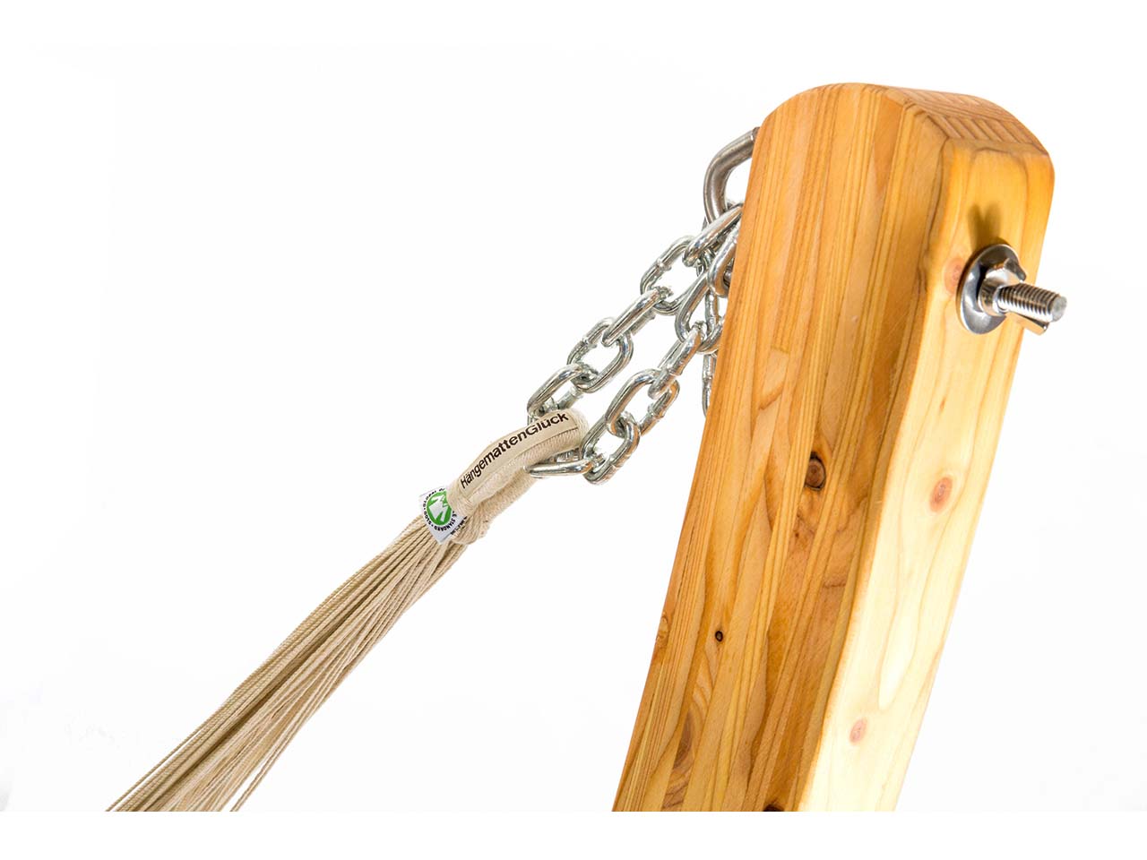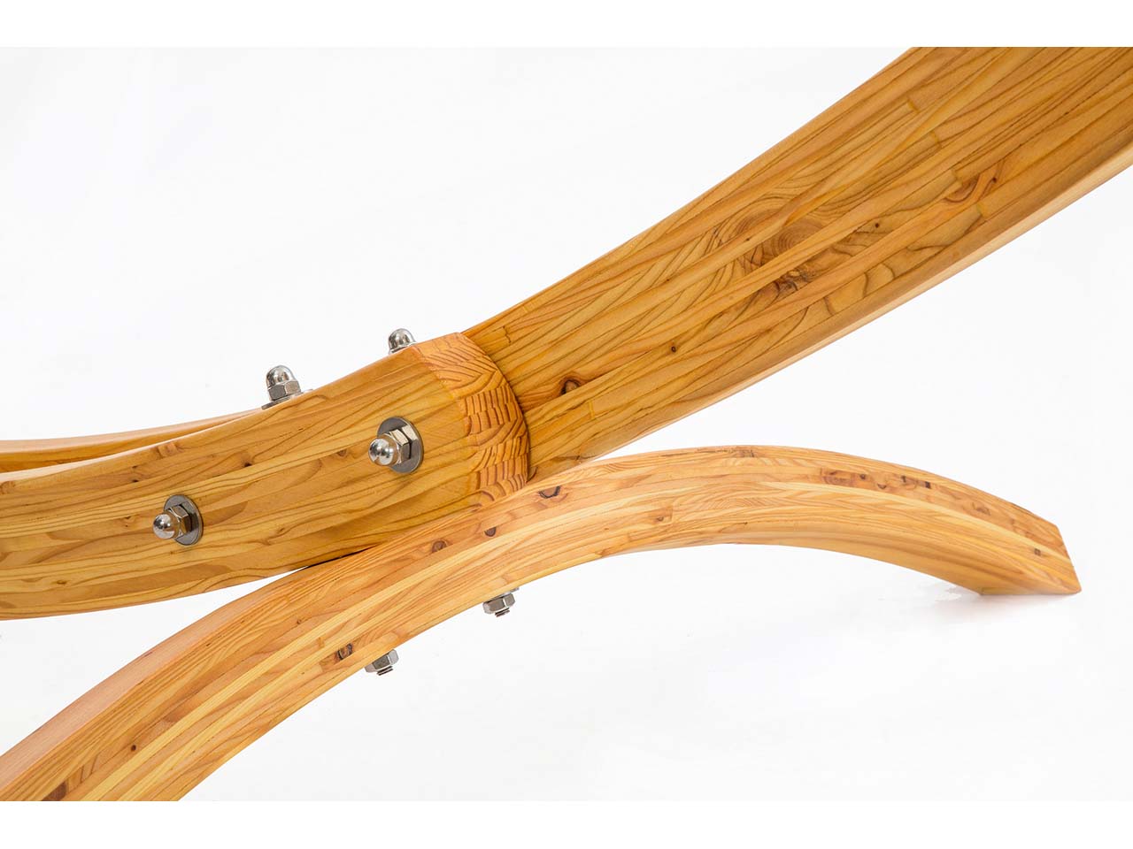 Dieses extra große Hängemattengestell ist in jedem Garten ein echtes Highlight. Es eignet sich für jede Hängematte und bietet viel Stabilität. Das Gestell aus europäischem Lärchenholz ist innerhalb weniger Minuten auf- und abgebaut. Das Holz, das auch im Schiffbau verwendet wird, ist besonders ölhaltig und daher wetterfest. Es braucht auch keine weitere Pflege. Durch den Wettereinfluss kann sich das Holz lediglich etwas grau verfärben oder kleinere Risse bekommen. Wer möchte, kann das Gestell einmal pro Jahr mit Leinöl nachpflegen. Das Hängemattengestell ist nicht nur groß, sondern hält auch viel aus: es trägt bis zu 160 kg! B 435 x T 160 x H 172.