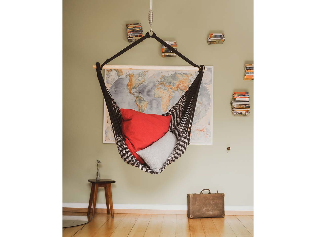 Passt überall hin und ist einfach gemütlich! Der Hängesitz ist durch seine Kompaktheit perfekt für kleinere Räume mit niedrigen Decken. Viel Platz braucht er nämlich nicht. Wo er aber hängt, sieht er gut aus und sorgt für viel Komfort. Das elastische Flechtmaterial aus GOTS-zertifizierter Bio-Baumwolle ist durch die Netzqualität besonders anschmiegsam. Das stützt den Körper optimal und schont auch den Rücken. Das Tuch lässt sich so ausbreiten, dass man auch die Beine ausstrecken kann. Praktisch: Der Hängesitz ist im Sommer genauso bequem wie im Winter und bereitet das ganze Jahr über Freude! Der stabile Spreizstab ist aus heimischem Eschenholz gefertigt. Sitzfläche 90 x 200 cm.