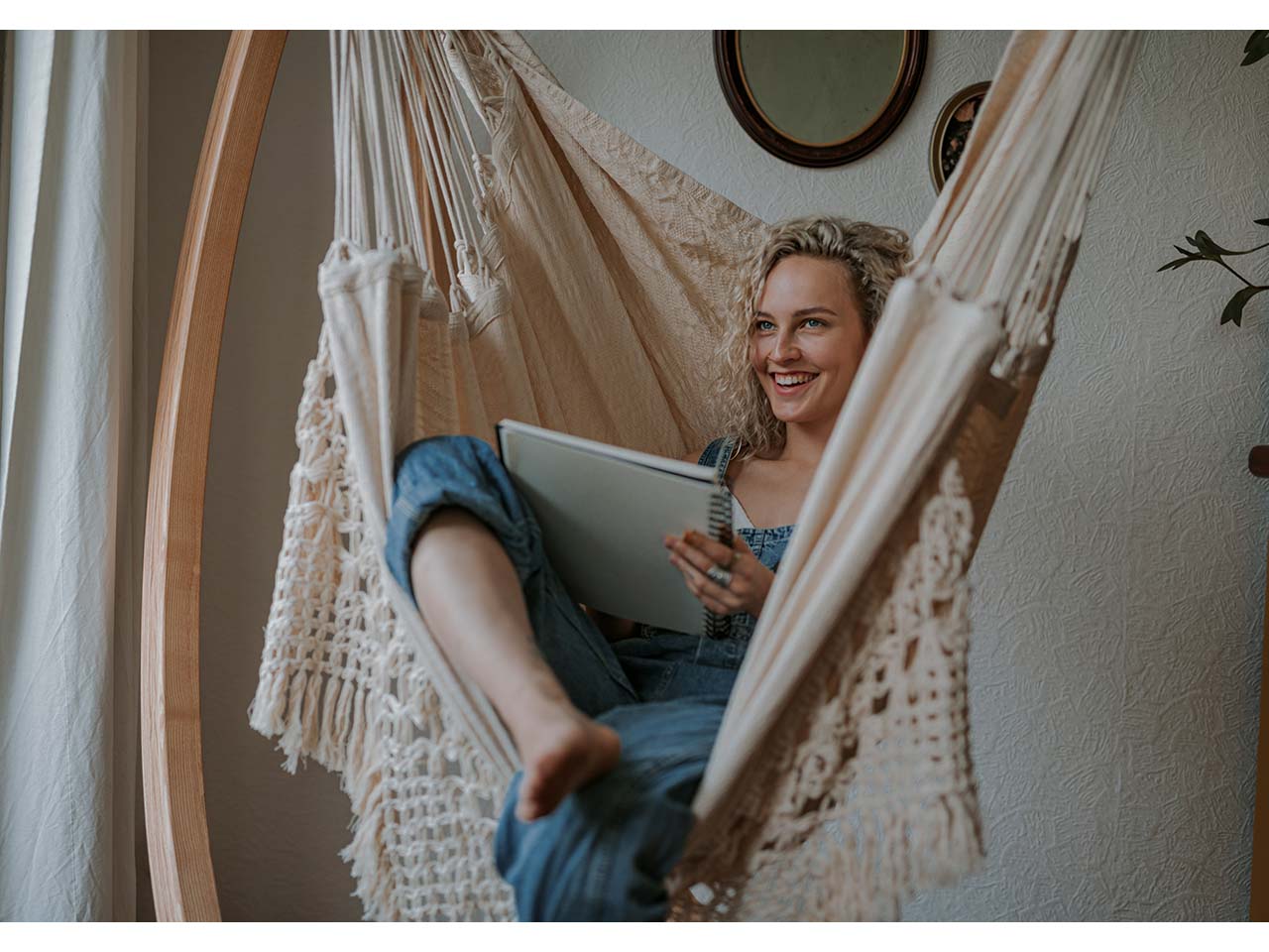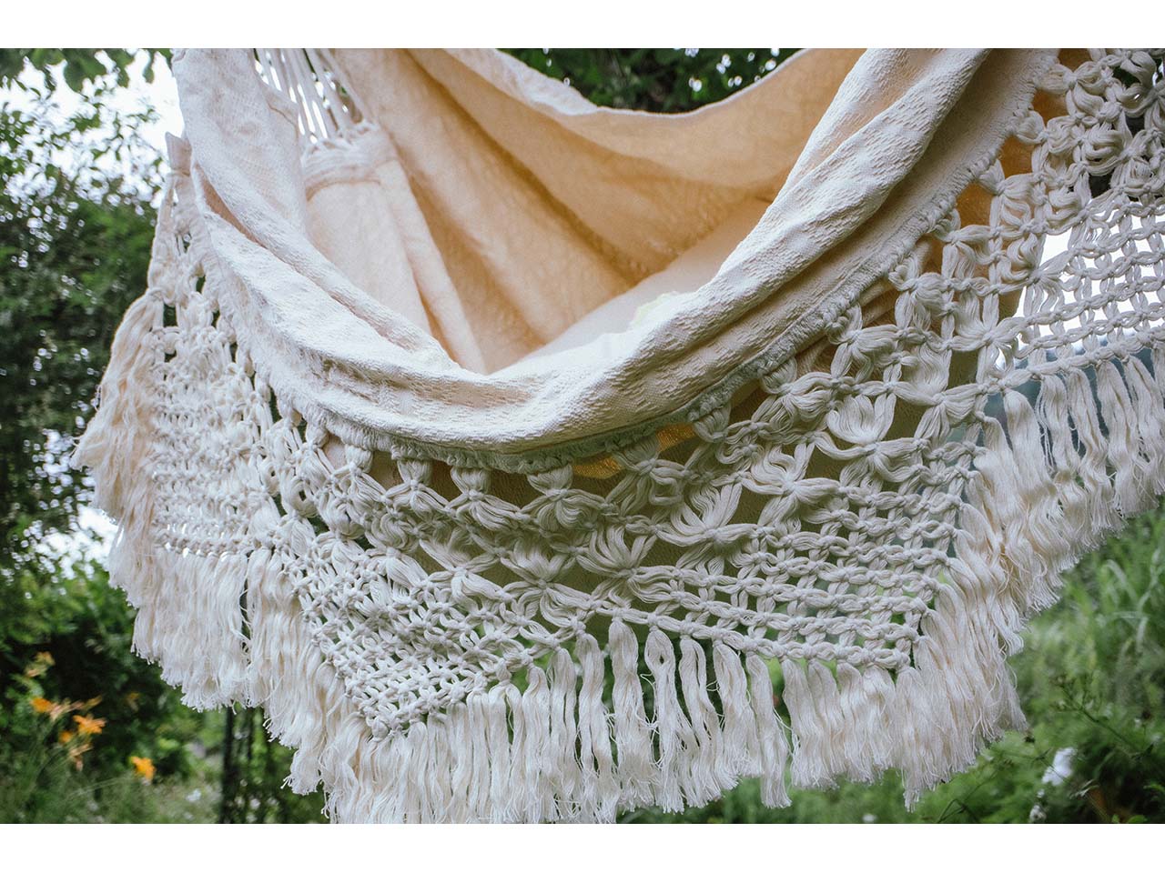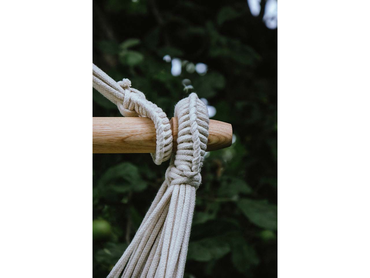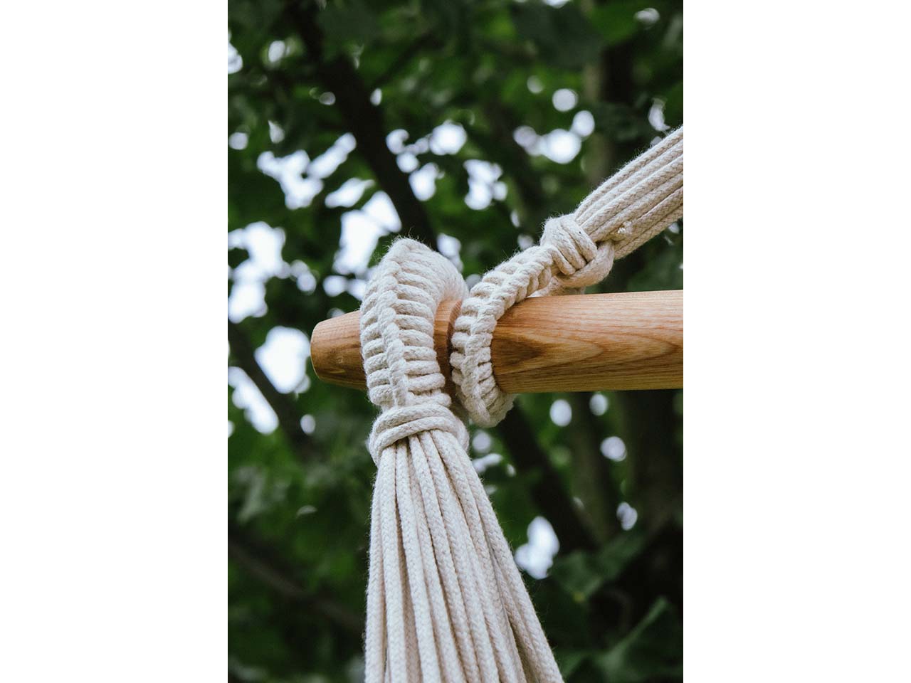 Schon beim Anblick gerät man ins Träumen: Das aufwendige Jacquard-Muster und die handgeknüpfte Borte verleihen dem Hängesitz eine besonders romantische Optik. Das Beste ist aber der exzellente Komfort: Die Tuchfläche ist aus weicher, GOTS-zertifizierter Bio-Baumwolle gefertigt und passt sich dank der großzügigen Stofflänge rundum an den Körper an. Es entsteht ein gemütlicher Rückzugsort für bis zu zwei Personen. Einfach reinsetzen und zurücklehnen, träumen und die Seele baumeln lassen. Der Hängesessel ist so groß, dass man sich auch ganz hineinlegen und die Beine ausstrecken kann! Der Spreizstab ist aus heimischem Eschenholz gefertigt, unterstreicht die Natürlichkeit und sorgt für viel Stabilität. Sitzfläche 130 x 200 cm.