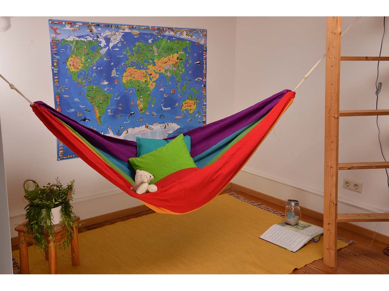 Ein Platz zum Austoben, Lesen und Träumen! In dieser robusten Kinderhängematte machen es sich Kinder bis ca. 8 Jahre so richtig schön gemütlich. Das handgearbeitete Tuch aus GOTS-zertifizierter Bio-Baumwolle ist nicht nur weich, sondern auch besonders strapazierfähig. So können Kinder darin ganz unbeschwert spielen. Noch mehr Sicherheit entsteht durch die Verarbeitung der Enden. Die Hängematte für Kinder kann im Kinderzimmer oder draußen angebracht werden. Der praktische Stoffbeutel ermöglicht eine einfache Mitnahme und dient als platzsparende Unterbringung bei Nichtgebrauch. Sitzfläche 120 x 200 cm.