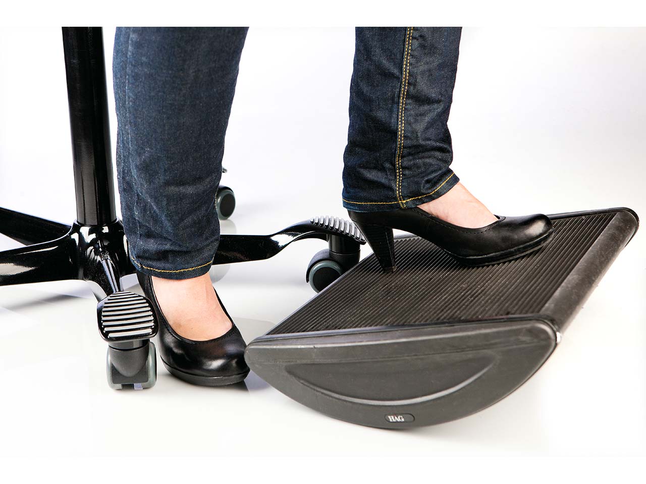 Die HAG Fußstütze "Quickstep" mit großer Trittfläche hilft, Haltungsschäden vorzubeugen. Gelenke und Muskeln werden angeregt und die Durchblutung und Konzentration gefördert. Entspricht der EU-Richtlinie zur Bildschirmarbeit. B 43 x T 33x H 9,8 cm. Farbe schwarz.