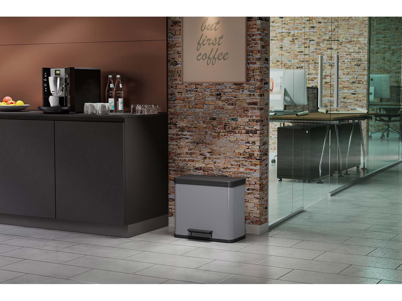 Der rechteckige Hailo Treteimer "ProfiLine Solid Öko-Trip" aus Edelstahl oder korrosionsfestem, pulverbeschichtetem Stahlblech bietet 3 herausnehmbare Inneneimer mit 9 l zur Abfallsortierung. Der Abfalleimer schließt mit "Soft Close", hat einen großen Öffnungswinkel zum leichten Befüllen und ein ergonomisches, breites Fußpedal. B 47 x T 25 x H 43 cm.