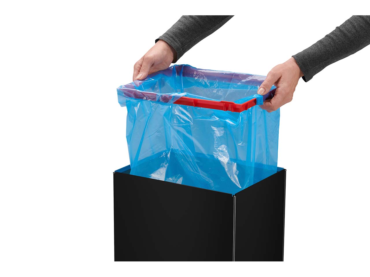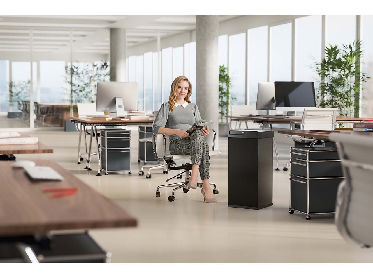 Edle Optik und ganz viel Funktion: Der Großraum-Mülleimer von Hailo punktet mit seinem selbstschließenden Schwingdeckel und einem modernen Äußerem, das sich nahtlos in Büro- und Arbeitsumgebungen einfügt. Die Müllbox verfügt über 4 Anti-Rutsch-Füße, sodass ein sicherer Stand stets gegeben ist. Das Rechteck-Gehäuse ist mit einem Klemmrahmen ausgestattet, wodurch sich Müllbeutel sicher einklemmen lassen. Die praktischen Schwingdeckelflügel können bei Bedarf für eine dauerhafte Öffnung auch festgestellt werden. Der Mülleimer hat ein Volumen von 52 l. B 33,9 x T 26 x H 76,3 cm.
