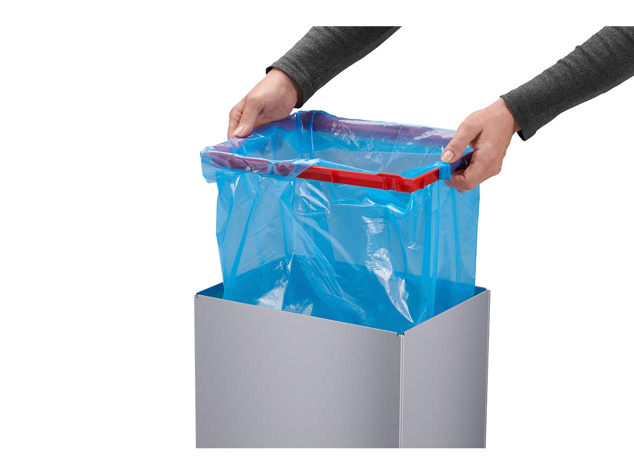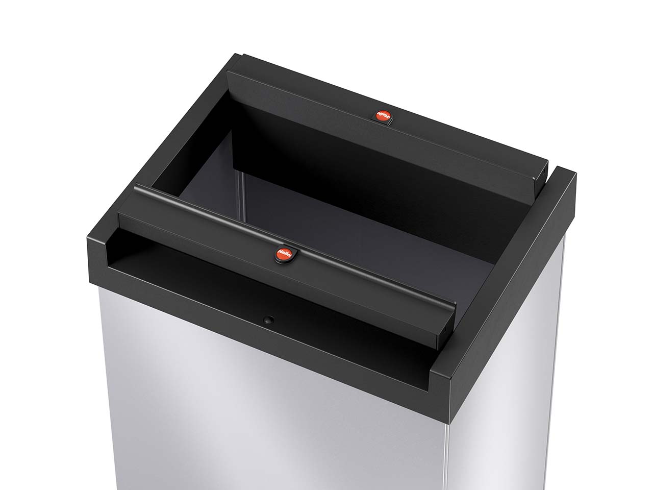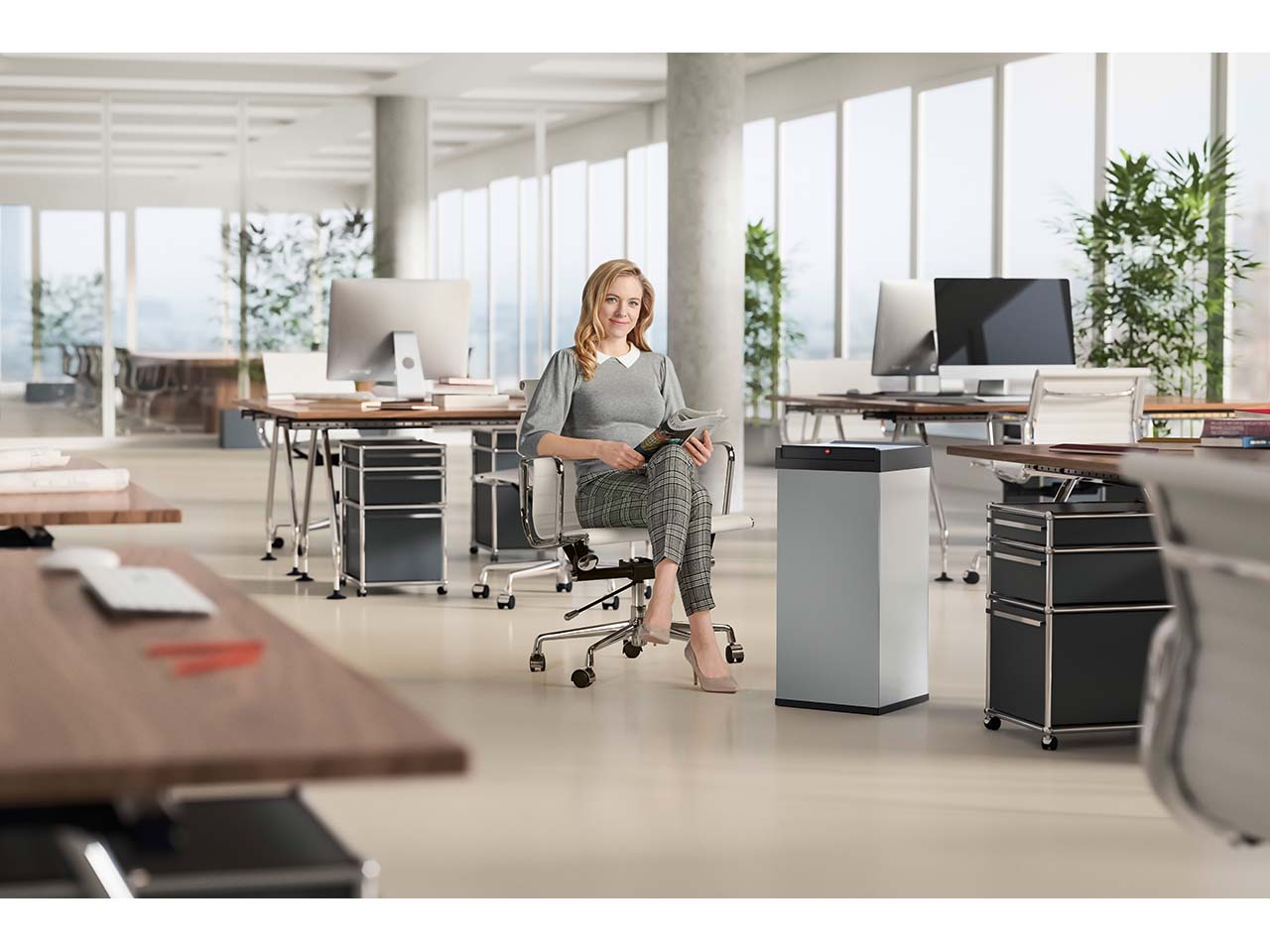 Edle Optik und ganz viel Funktion: Der Großraum-Mülleimer von Hailo punktet mit seinem selbstschließenden Schwingdeckel und einem modernen Äußerem, das sich nahtlos in Büro- und Arbeitsumgebungen einfügt. Die Müllbox verfügt über 4 Anti-Rutsch-Füße, sodass ein sicherer Stand stets gegeben ist. Das Rechteck-Gehäuse ist mit einem Klemmrahmen ausgestattet, wodurch sich Müllbeutel sicher einklemmen lassen. Die praktischen Schwingdeckelflügel können bei Bedarf für eine dauerhafte Öffnung auch festgestellt werden. Der Mülleimer hat ein Volumen von 52 l. B 33,9 x T 26 x H 76,3 cm.