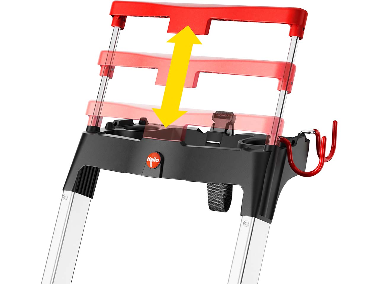 Die in Deutschland hergestellte Stehleiter von Hailo zeichnet sich durch Standfestigkeit aus. Die Plattformverriegelung ermöglicht ein sicheres Ver- und Entriegeln. Die 5 XXL-Stufen mit Anti-Rutsch-Riffelung und extra tiefe Standfläche bieten viel Sicherheit beim Stehen. Festhalten kann man sich dank ausziehbarem Sicherheits-Haltebügel. Dank optimierter Mechanik gestaltet sich die Bedienung problemlos. Praktisch ist auch die Ablageschale, die Platz für Werkzeuge, Farbdosen, Kleinteile und Co. bietet. Auch eine Eimerschlaufe ist vorhanden, sodass Eimer, Staubsauger oder Kabeltrommeln sicher befestigt werden können. Weiterhin verfügt die Stehleiter über einen Universalhaken, einen Stabhalter und eine High-Tech-vernietete Holm-Stufenverbindung. B 48 x H 187 cm.