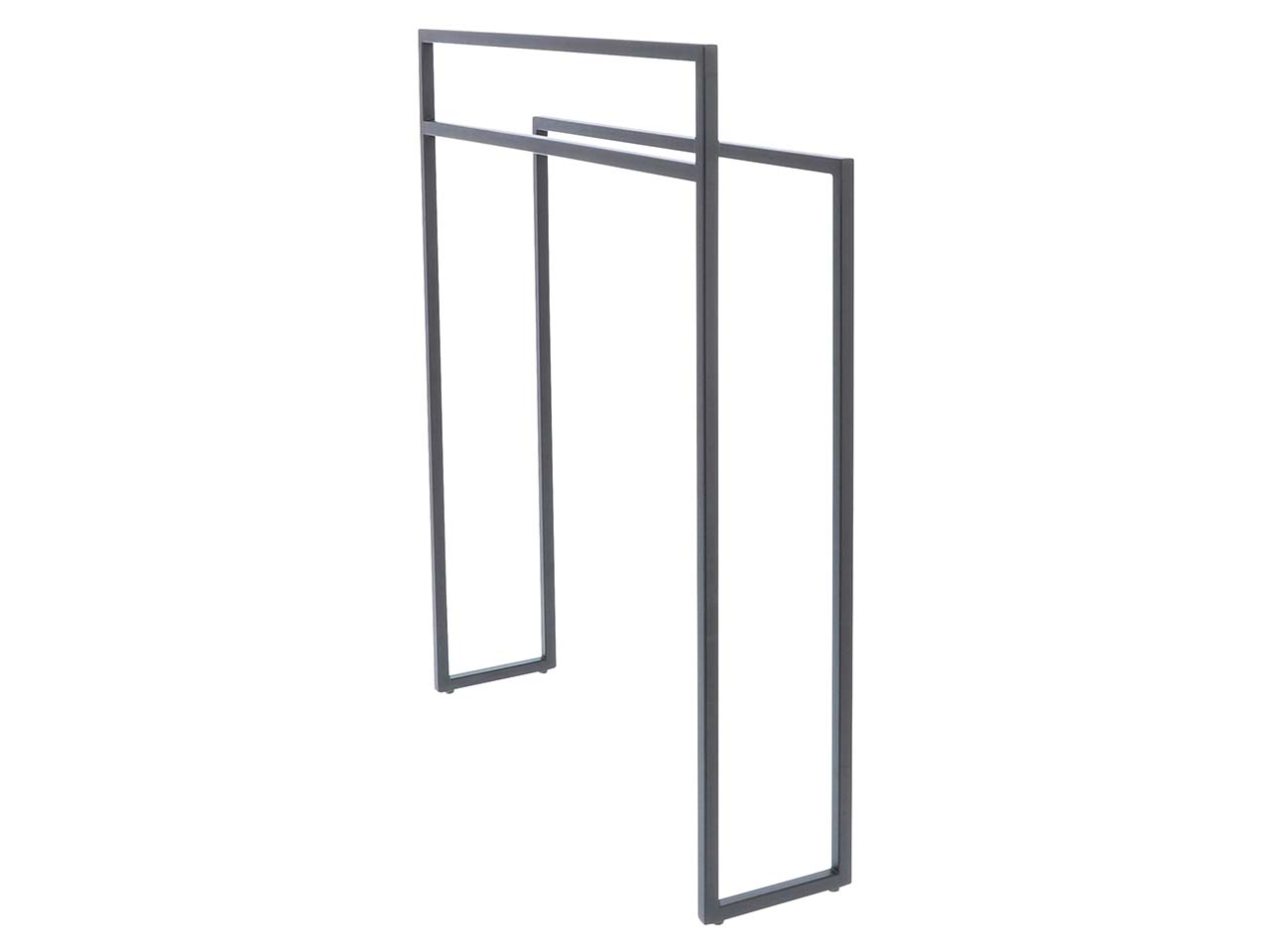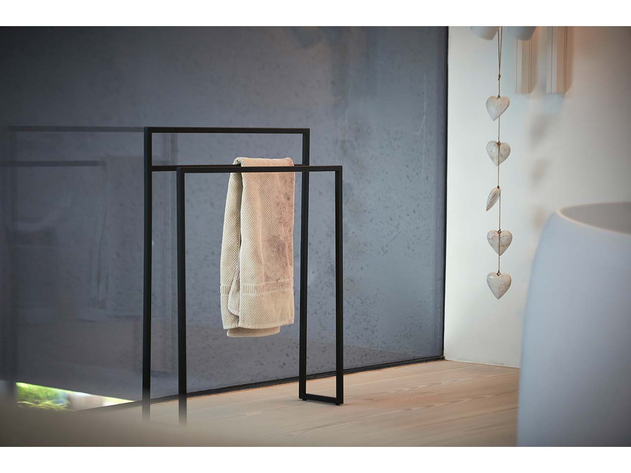 Jetzt zieht stilvolle Eleganz ins Badezimmer ein: Die schlichte, minimalistische Art von "level" macht aus dem Handtuchhalter ein Designobjekt, das aber eben auch außerordentlich praktisch ist. Durch die Fertigung aus pulverbeschichtetem Stahlrohr erhält der Handtuchständer eine besonders strapazierfähige, langlebige Qualität. Über die Streben lassen sich neben Handtüchern auch Kleidung hängen. Aufgrund des dezenten Designs kann der Stehhalter auch z.B. im Schlafzimmer genutzt werden. Das Möbelstück ist ebenso vielseitig wie elegant. B 60 x T 20 x H 75 cm.