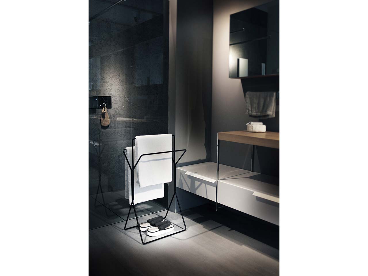 Stilvoller Helfer, der mehr Ordnung in den Alltag bringt: Dieser "wingman" lässt wirklich niemandem im Stich. Der raffiniert designte Handtuchhalter glänzt mit moderner Optik, die perfekt in Bade-, Schlaf- und Gästezimmer passt oder auch im Wellnessbereich eine gute Figur macht. Die außergewöhnliche Form aus pulverbeschichtetem Stahlrohr in Schwarz oder Weiß gibt dem schmalen Handtuchhalter eine exzellente Stabilität. Der stille Helfer bietet Ablagemöglichkeiten für Handtücher oder Kleidung. B 47 x T 33,5 x H 87 cm.