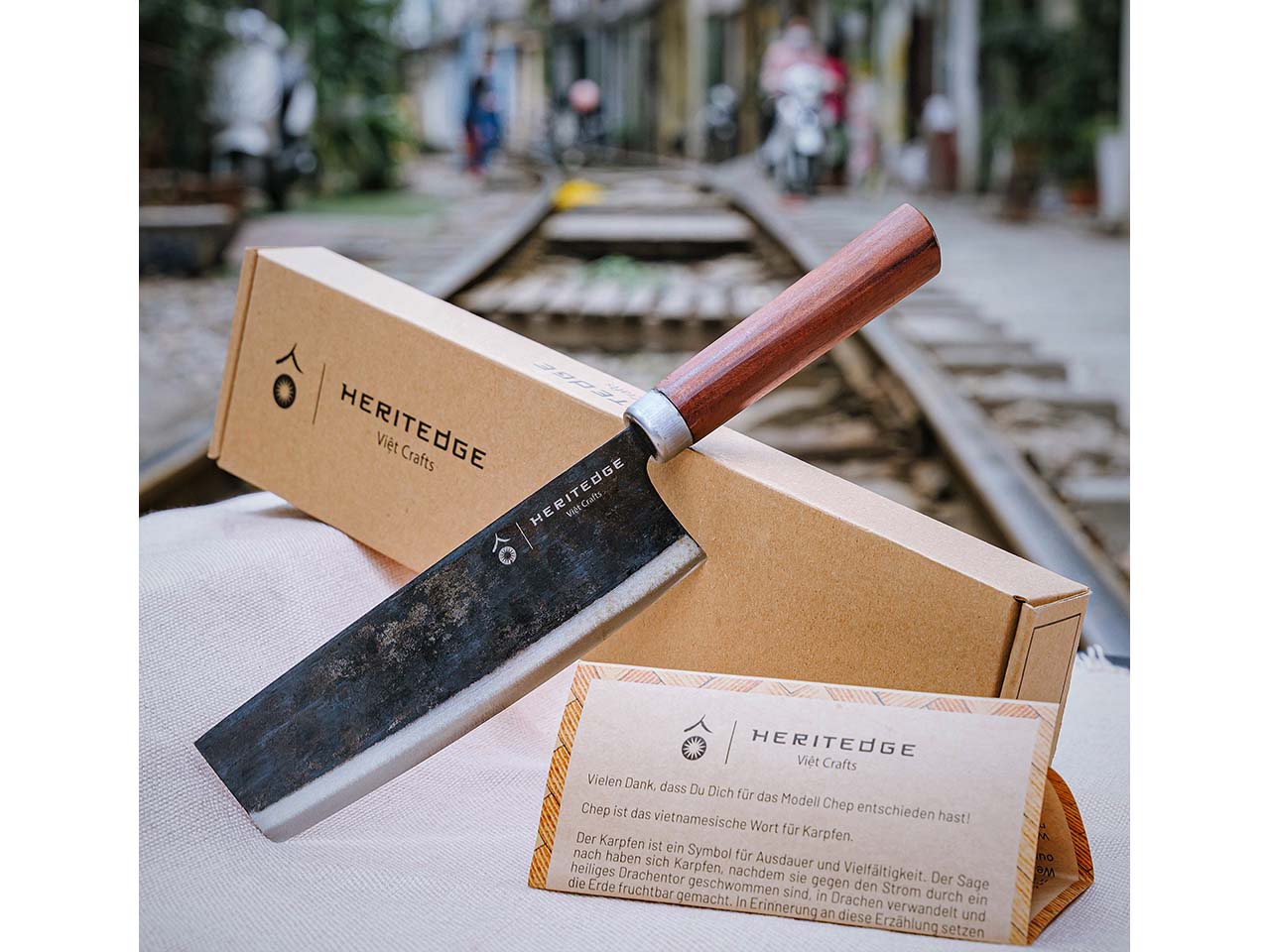 In der Provinz Cao Bang, eine abgelegene Region im Nordosten Vietnams, die ressourcenarm ist und nur wenig fruchtbare Böden aufweist, lebt die ethnische Minderheit der Nung, deren Schmiedetradition bis in das 11. Jahrhundert zurückreicht. Damals noch Schwerter und Kanonen, werden heute Messer und Werkzeuge hergestellt. Um die Menschen und das Kunsthandwerk dort zu unterstützen, arbeitet Heritedge direkt mit den herstellenden Familien zusammen und importiert die in Handarbeit gefertigten Messer ohne Zwischenhändler nach Deutschland.
