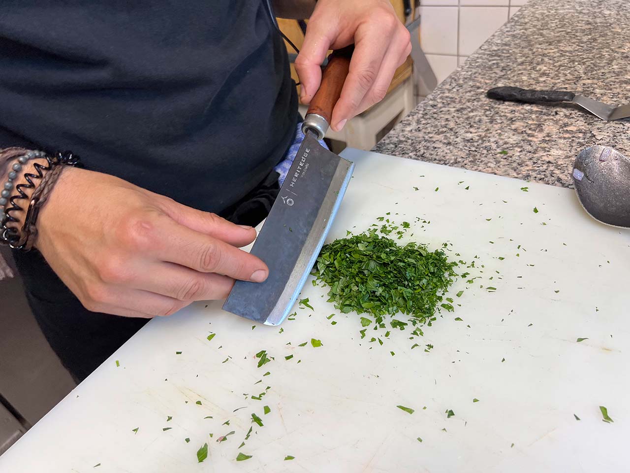 Karotten, Gurken, Kohl und jede andere Art von Gemüse schneidet das asiatische Gemüsemesser ganz ohne Problem! „Rua“ ist ein unverzichtbares Must-have für die Küche. Der Begriff Rua stammt auf dem vietnamesischem und bedeutet Schildkröte. Diese hat dort in der Kultur aufgrund ihrer Assoziation mit Weisheit und Langlebigkeit eine besondere Stellung. Als Namensgeber für das Küchenmesser passt das perfekt, denn dieses schneidet mit seiner präzisionsgeschliffenen, rechteckigen Klinge aus Carbonstahl, die einen hohen Härtegrad von 60-61 HRC aufweist, butterweich. Der traditionelle Griff aus massivem, schwarz-rotem Eisenholz liegt wunderbar in der Hand und vereinfacht so das Schneiden. Die Messerspitze ist speziell für das Schneiden von Gemüse leicht abgerundet. Hergestellt wird das Gemüsemesser in einer traditionellen Schmiedemanufaktur im Norden Vietnams. L 30 cm.