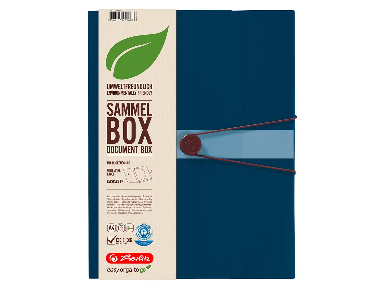 Die herlitz Sammelbox aus Recycling-PP ist ideal für Dokumente im Format DIN A4. Sie hat 3 Einschlagklappen, Gummizug, einen Verschlussknopf sowie ein aufgeklebtes Rückenschild.