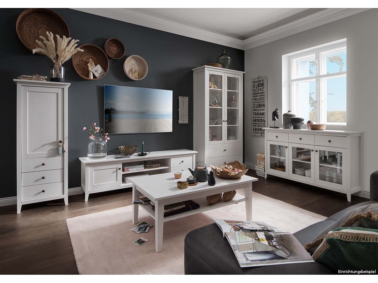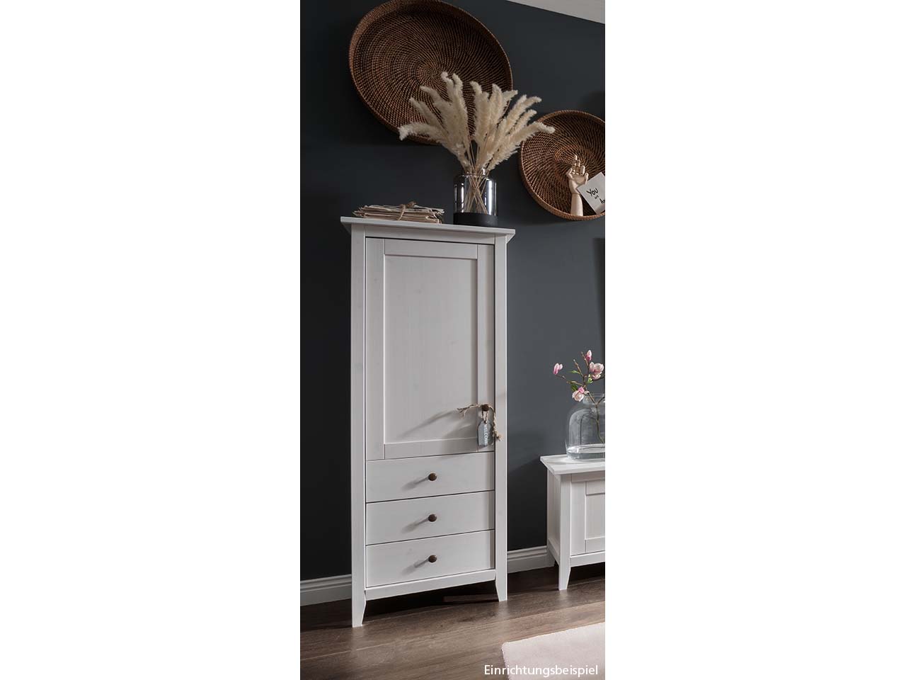 Wo das Highboard auch steht, es vermittelt einen natürlichen Charme. Das Design ist zeitlos gehalten und punktet mit raffinierten Details wie den nach unten spitz zulaufenden Füßen. Zur Aufbewahrung von verschiedenen Dingen stehen drei Schubladen zur Verfügung. Hinter der Holztür befindet sich weiterer Stauraum. Durch die Herstellung aus FSC-zertifiziertem Kiefernholz ist das Möbelstück ausgesprochen langlebig und robust. Das Highboard ist gelaugt oder in Weiß erhältlich. B 58 x T 40 x H 150 cm.