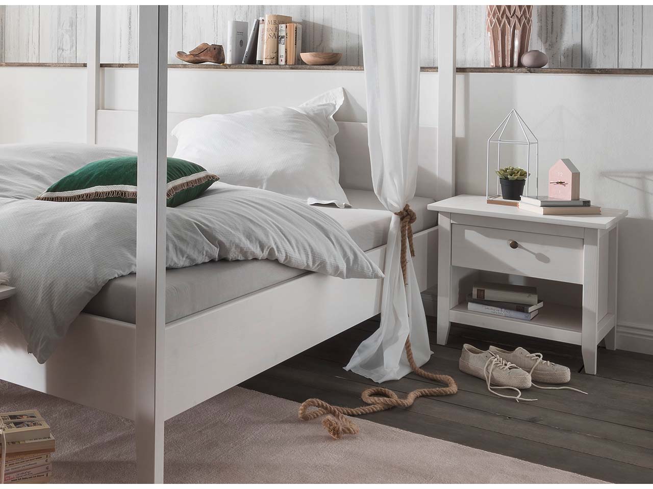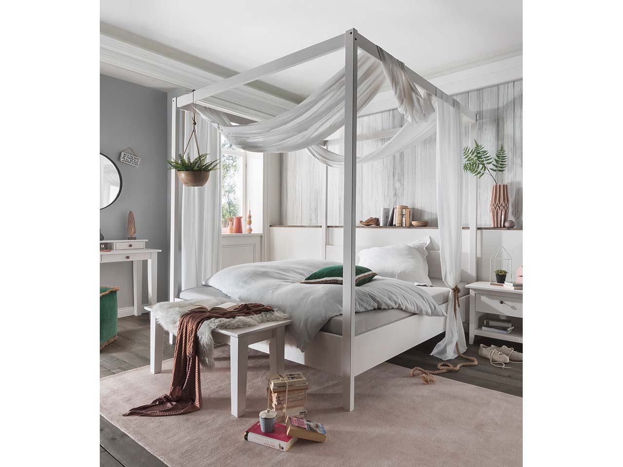 Himmlisch gut schlafen! Himmelbetten wirken immer romantisch und gemütlich. Vor allem dann, wenn sie wie dieses hier aus massivem, FSC-zertifiziertem Kiefernholz gefertigt sind. Das Holz verleiht dem Gestell einen besonders natürlichen Charakter. Highlight ist der Baldachin, der Himmelbetten auszeichnet. Im Mittelalter, wo diese Art von Bett seinen Ursprung hat, schliefen nur Adlige in Himmelbetten. Die angebrachten Textilvorhänge versprachen Sichtschutz und spendeten Wärme. Heute bringt man eher aus Schutz vor Insekten oder aus optischen Gründen Vorhänge an dem Bett an. Es ist aber auch ohne Textilvorhänge eine Augenweide! Das Gestell ist minimalistisch designt und verfügt über ein Kopfteil. In Weiß oder Natur (gelaugt) und verschiedenen Größen erhältlich.