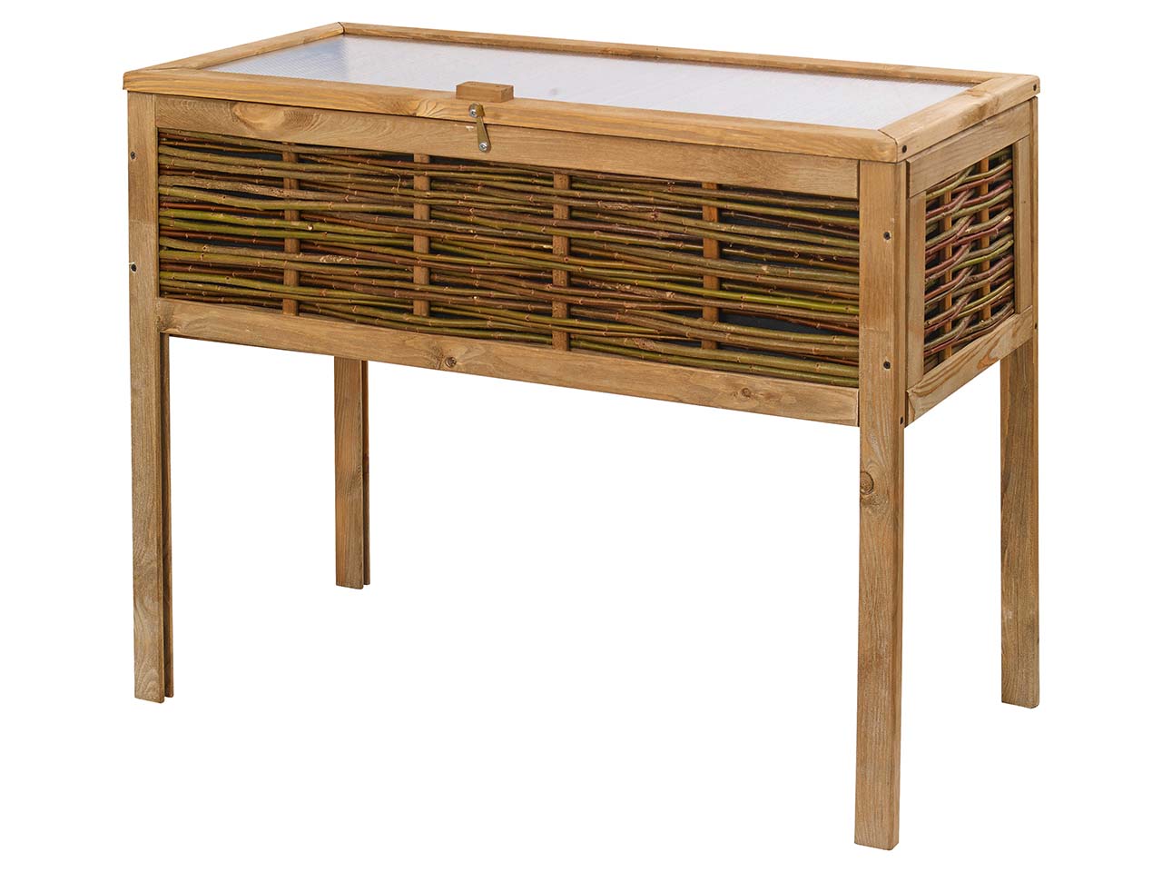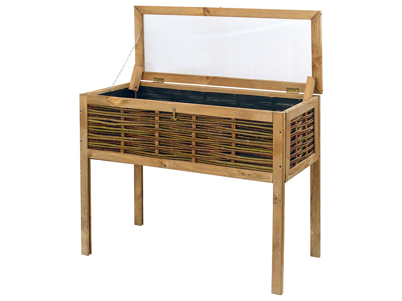 Das handgearbeitete Hochbeet mit 4 stabilen Beinen wird aus lasiertem Kiefernholz und Weidenruten hergestellt. Das Hochbeet ist sehr dekorativ, hat einen stabilen Holzrahmen und ein Innenvlies. Das Deckelfenster besteht aus Stegdoppelplatten. Das Hochbeet wird als leicht montierbarer Bausatz geliefert. Das Hochbeet auf Beinen eignet sich sehr gut für Kinder, Senioren und Rollstuhlfahrer. B 100 x T 40 x H 80 cm.