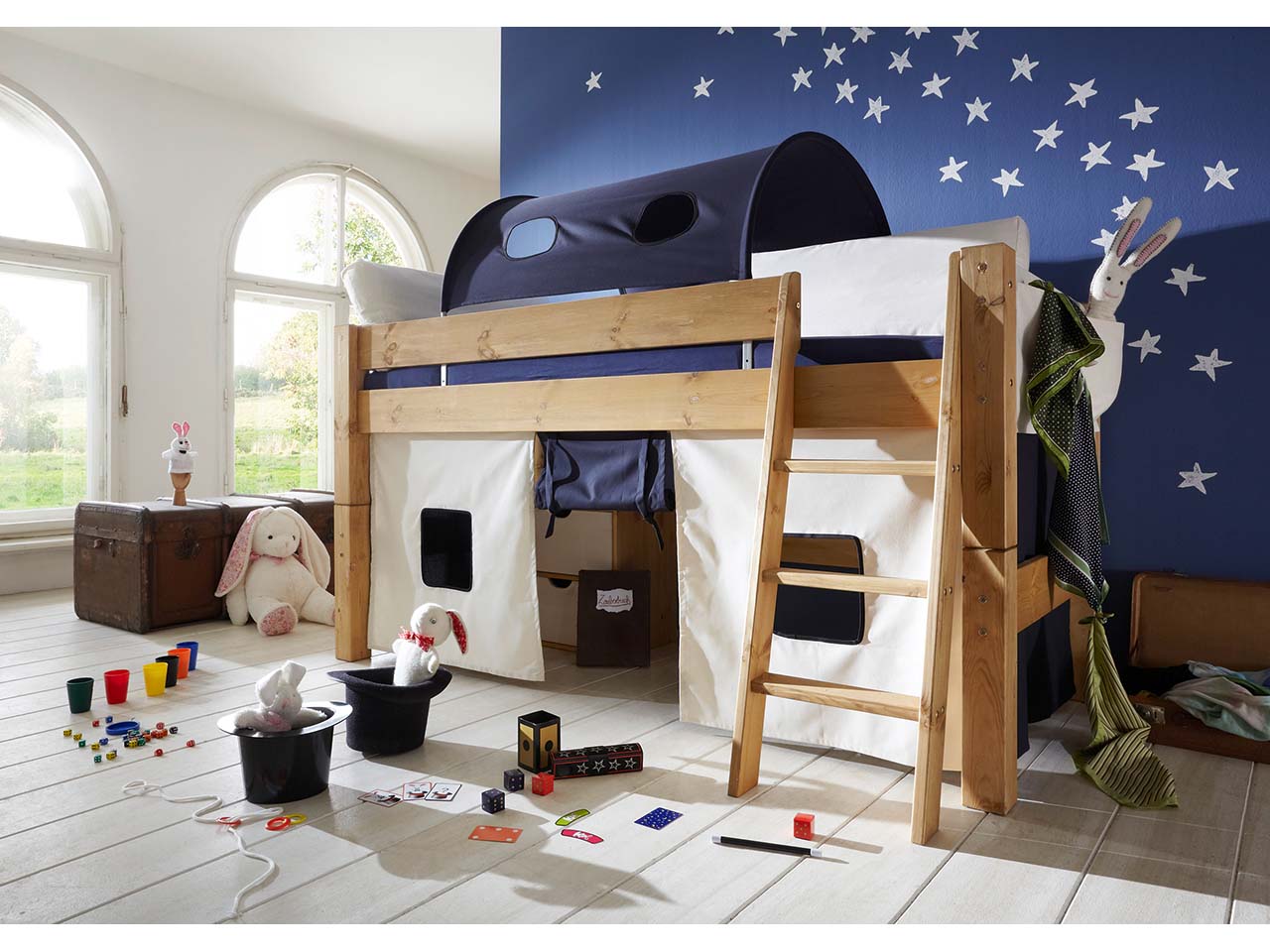 Hier schaffen sich Kinder ihr eigenes kuscheliges Reich! Das halbhohe Hochbett bietet unter der Liegefläche noch Platz für eine kleine Spiel- und Wohlfühloase. Dabei überzeugt das Bett durch hervorragende Qualität und Stabilität, denn es ist aus massivem, FSC-zertifiziertem Kiefern- oder Buchenholz gefertigt. Bei Bedarf kann das Hochbett auch zum Einzelbett umgebaut werden. Ideal, wenn sich die Bedürfnisse des Kindes ändern. Ein Rollrost und eine kurze Leiter sind im Lieferumfang enthalten. Die Leiter kann rechts oder links montiert werden. B 90 x T 200 x H 110 cm.