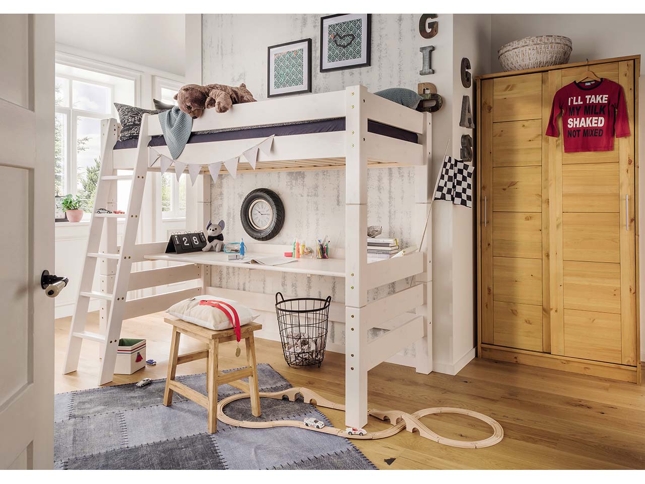 Hier haben Kinder ganz viel Platz! Das Hochbett vereint Schlafplatz und Spielstätte. Dabei überzeugt das Gestell dank Herstellung aus massivem, FSC-zertifiziertem Holz mit hervorragender Stabilität. Das Bett erreichen Kinder über die praktische Schrägleiter, die rechts oder links montiert werden kann. Die mitgelieferte Absturzsicherung erhöht die Sicherheit. Im unteren Bereich können sich Kinder ganz nach ihren Ideen und Wünschen einrichten. Der Platz eignet sich z.B. zum Aufstellen eines Schreibtisches. B 90 x T 200 x H 169 cm.