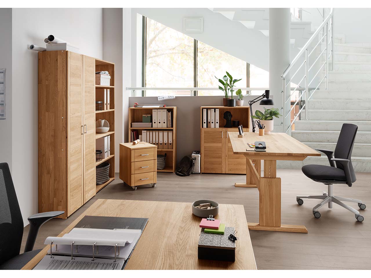 Dieser Schreibtisch vereint Ästhetik und Funktionalität. Die massive, geölte Wildeiche ist mit ihrer kräftigen Maserung ein Blickfang und versprüht natürlichen Charme. Gleichzeitig überzeugt der Schreibtisch durch seine hohe Stabilität und Langlebigkeit. Da der Tisch manuell höhenverstellbar ist, kann er individuell auf die Arbeitshöhe angepasst und von verschiedenen Personen genutzt werden. Das C-Fußgestell lässt viel Platz, um z.B. einen Rollcontainer unter den Tisch zu stellen. B 160 x T 80 x H 61-80 cm.
